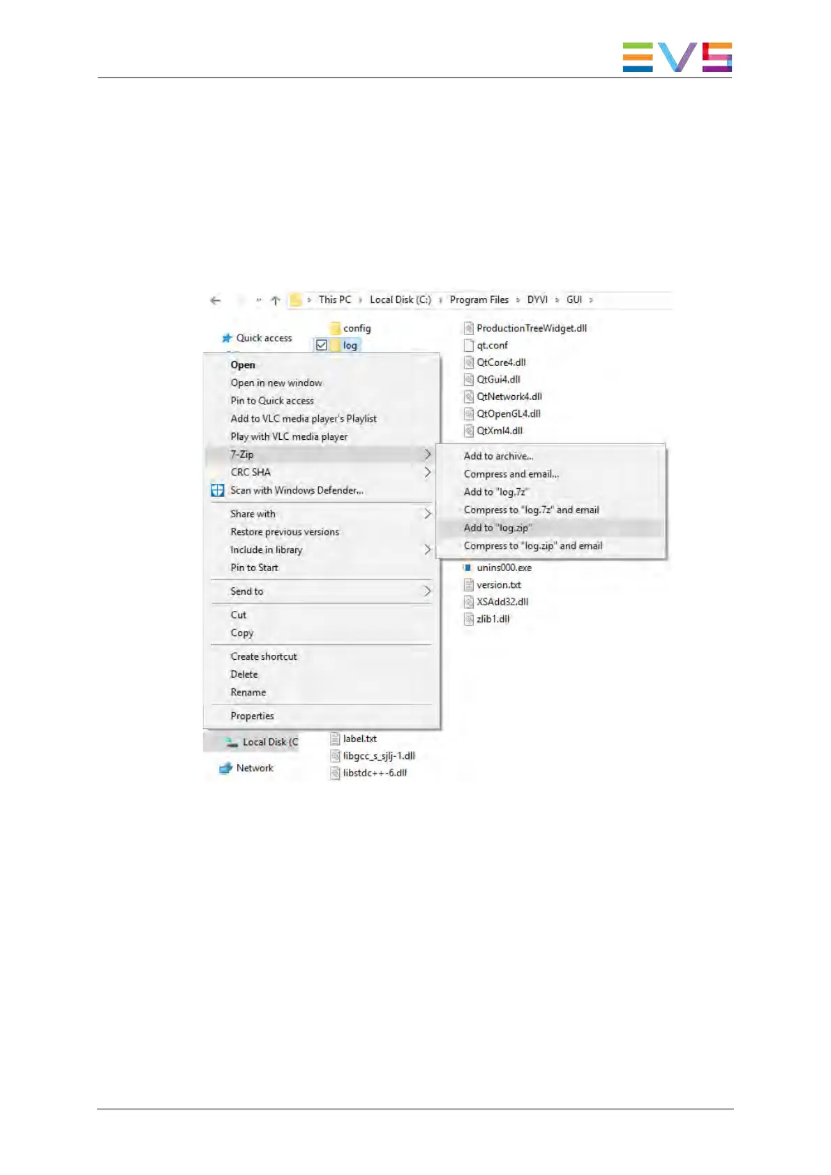 3. Right-click the log folder and select 7-Zip > Add to “log.zip”.