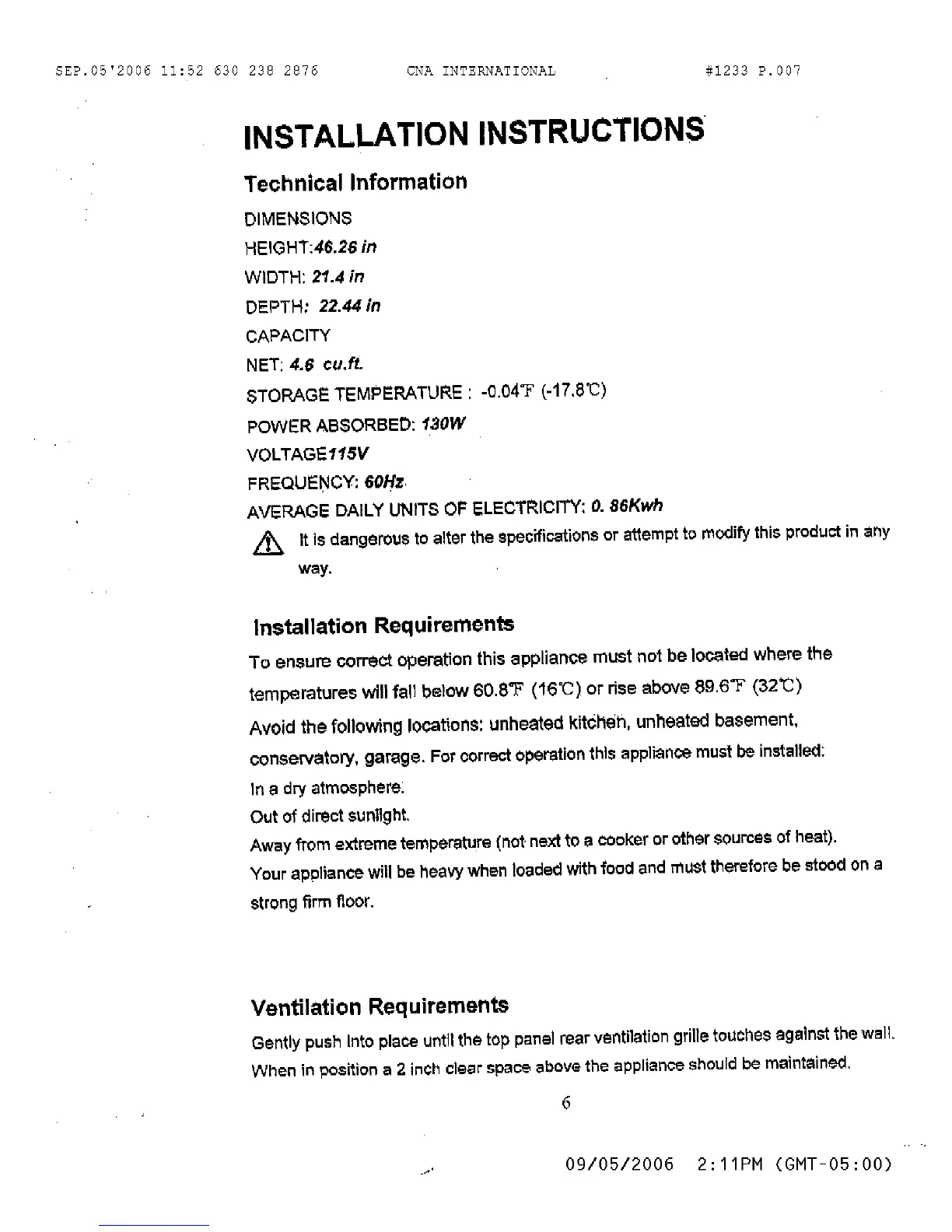 Ewave EWUF5W - INSTALLATION INSTRUCTIONS; Installation Requirements; Ventilation Requirements