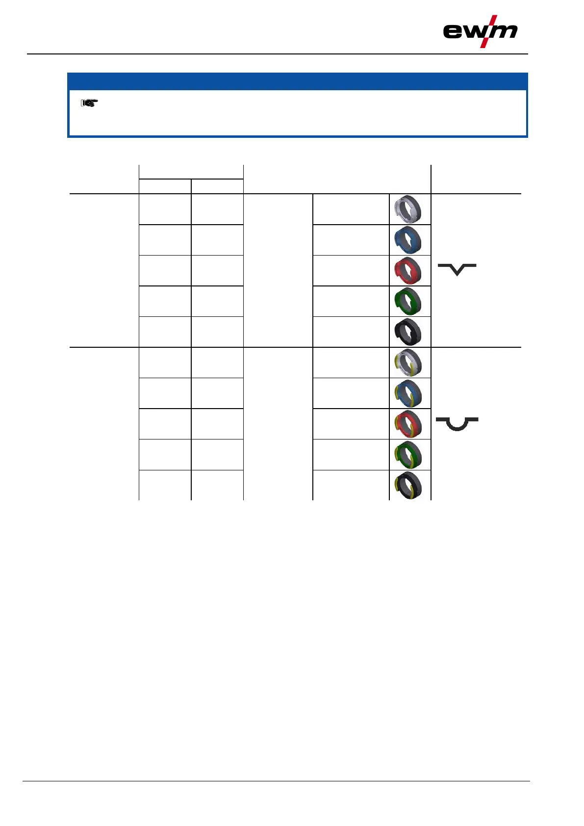 feed rollers are colour-coded to facilitate distinction (see the Wire feed roller overview table).