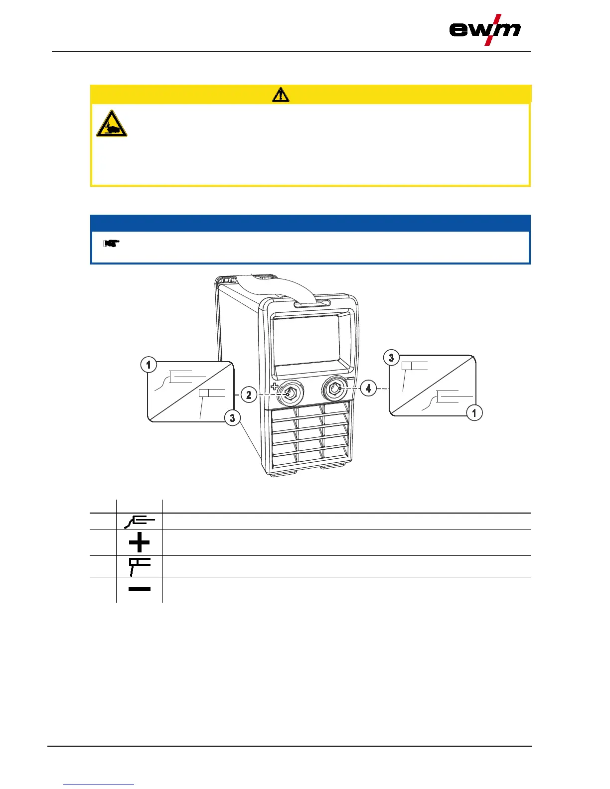 • Insert cable plug of the electrode holder into either the "+" or "-" welding current connection socket and