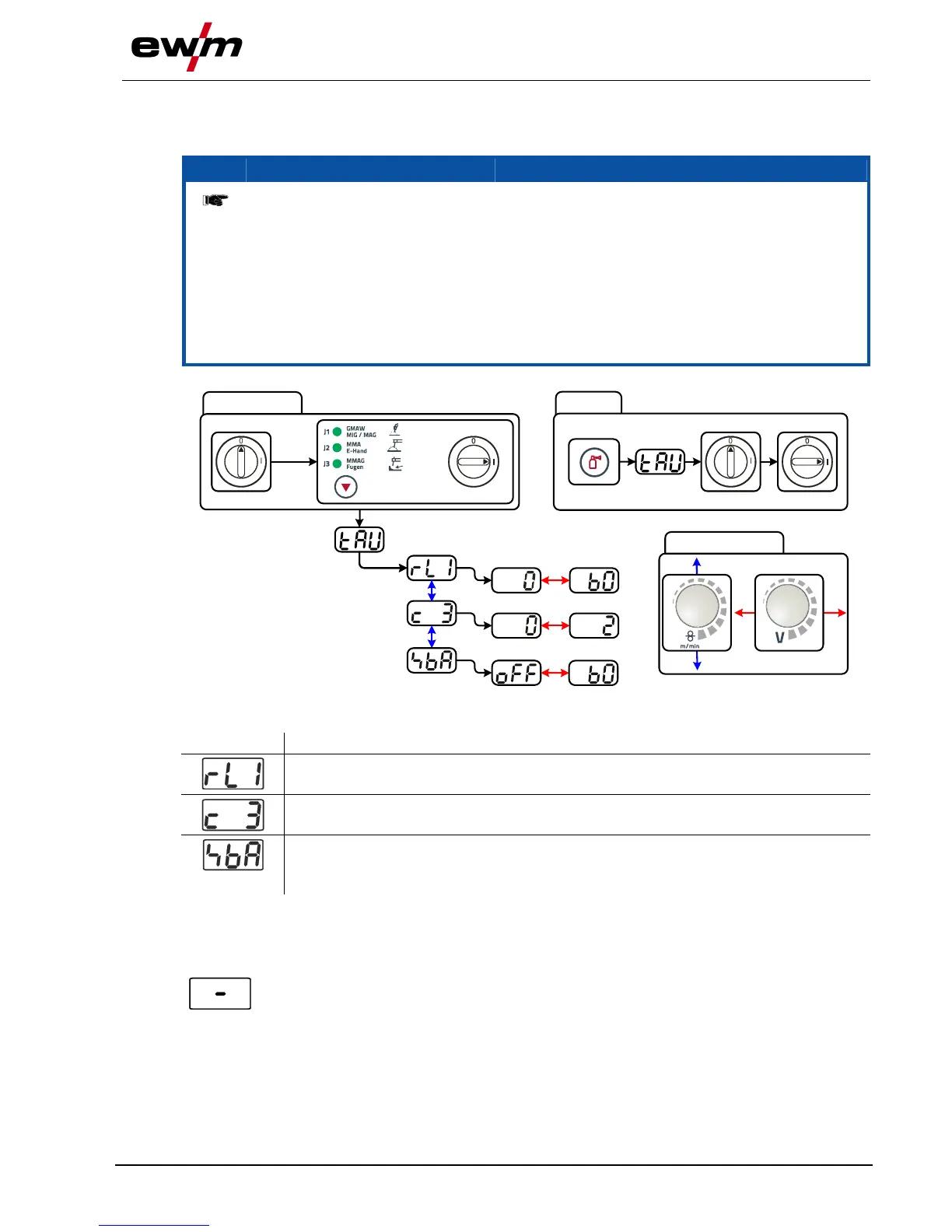 • Press and hold the "welding procedure" push-button and switch the machine on again at