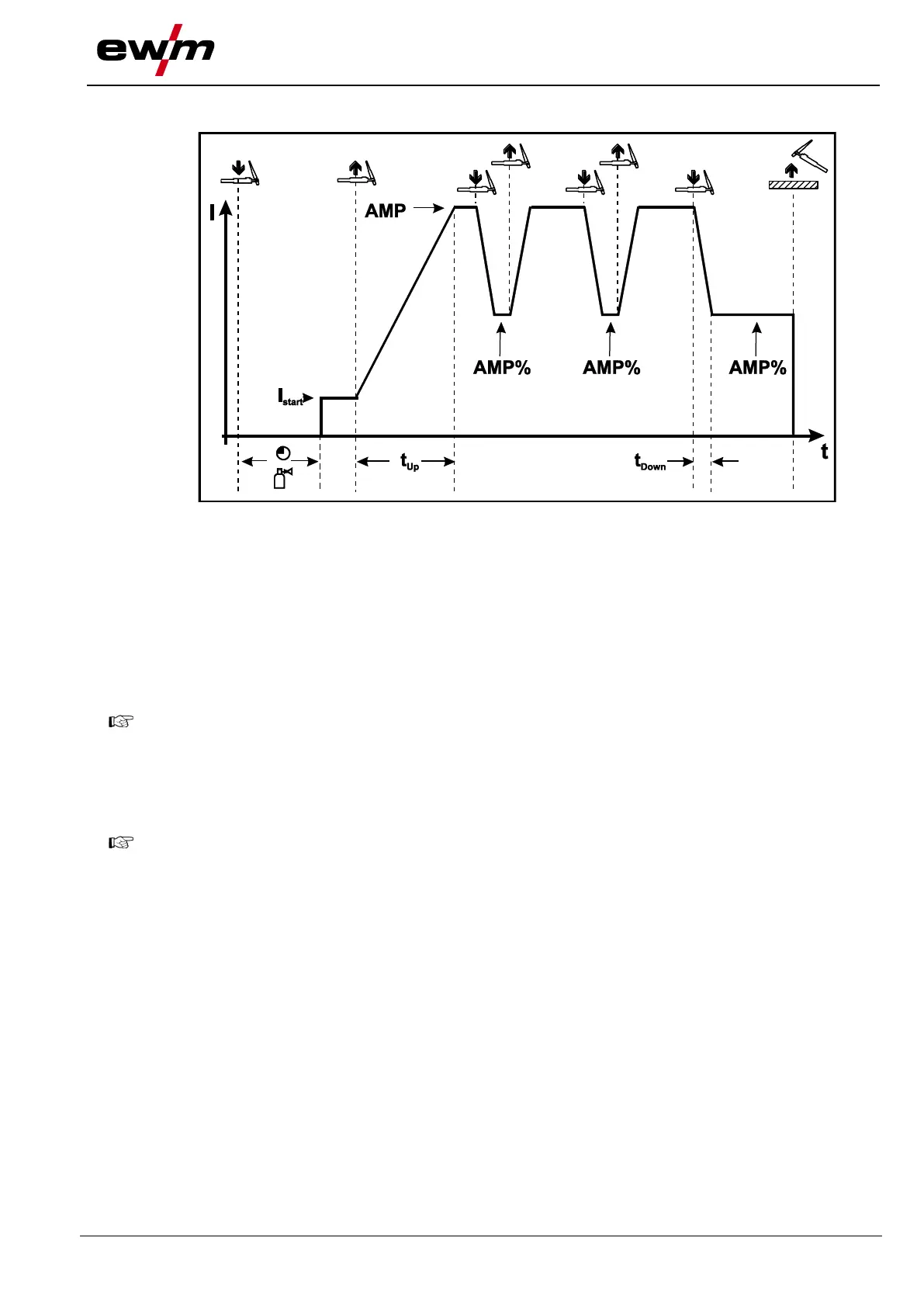 Pressing torch trigger 1 starts the slope (tS1) from main current AMP to secondary current