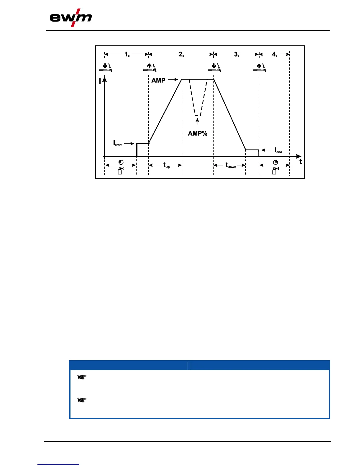• Welding current flows and immediately assumes the ignition current value set (search arc at minimum