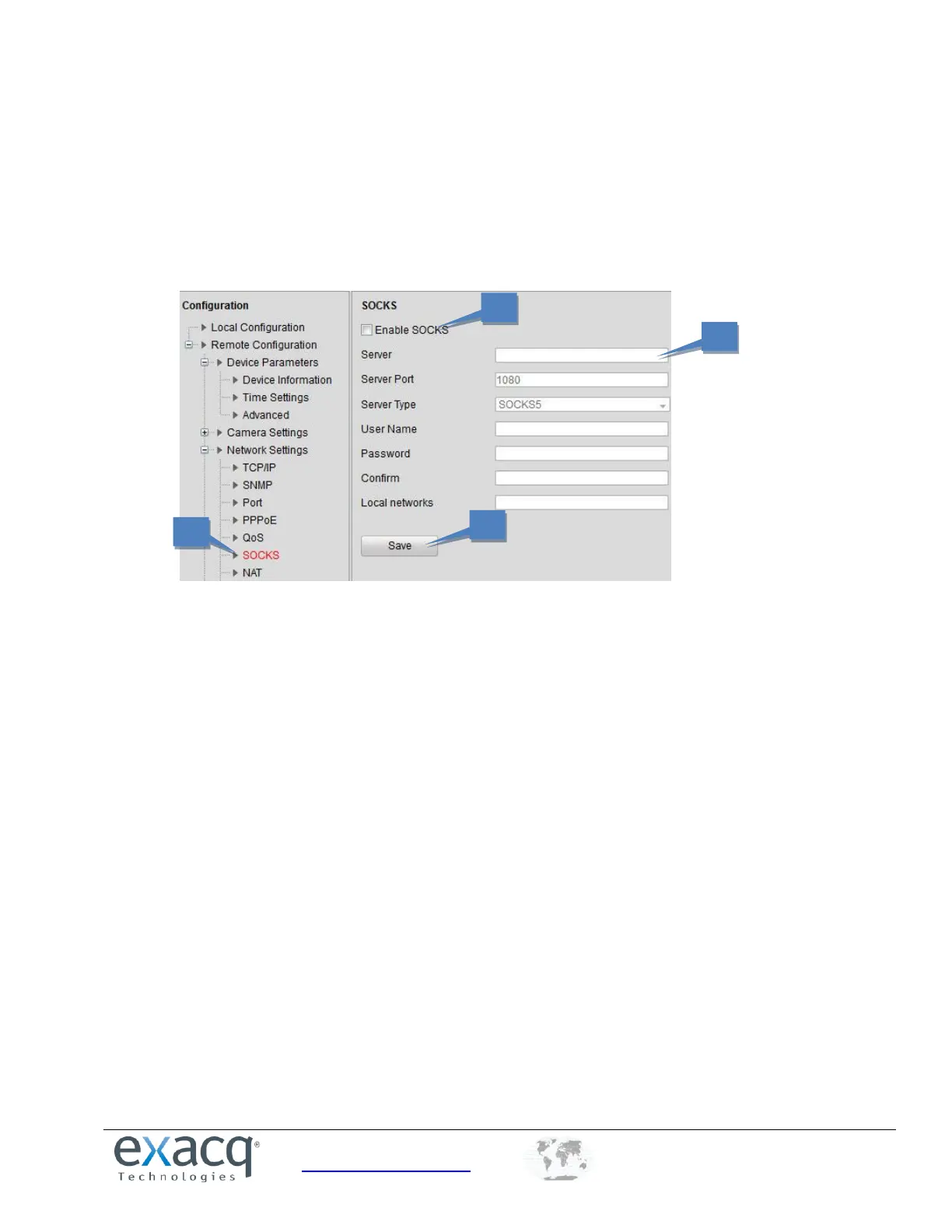1. From the Remote Configuration menu, select Network Settings and then SOCKS to open the SOCKS Settings