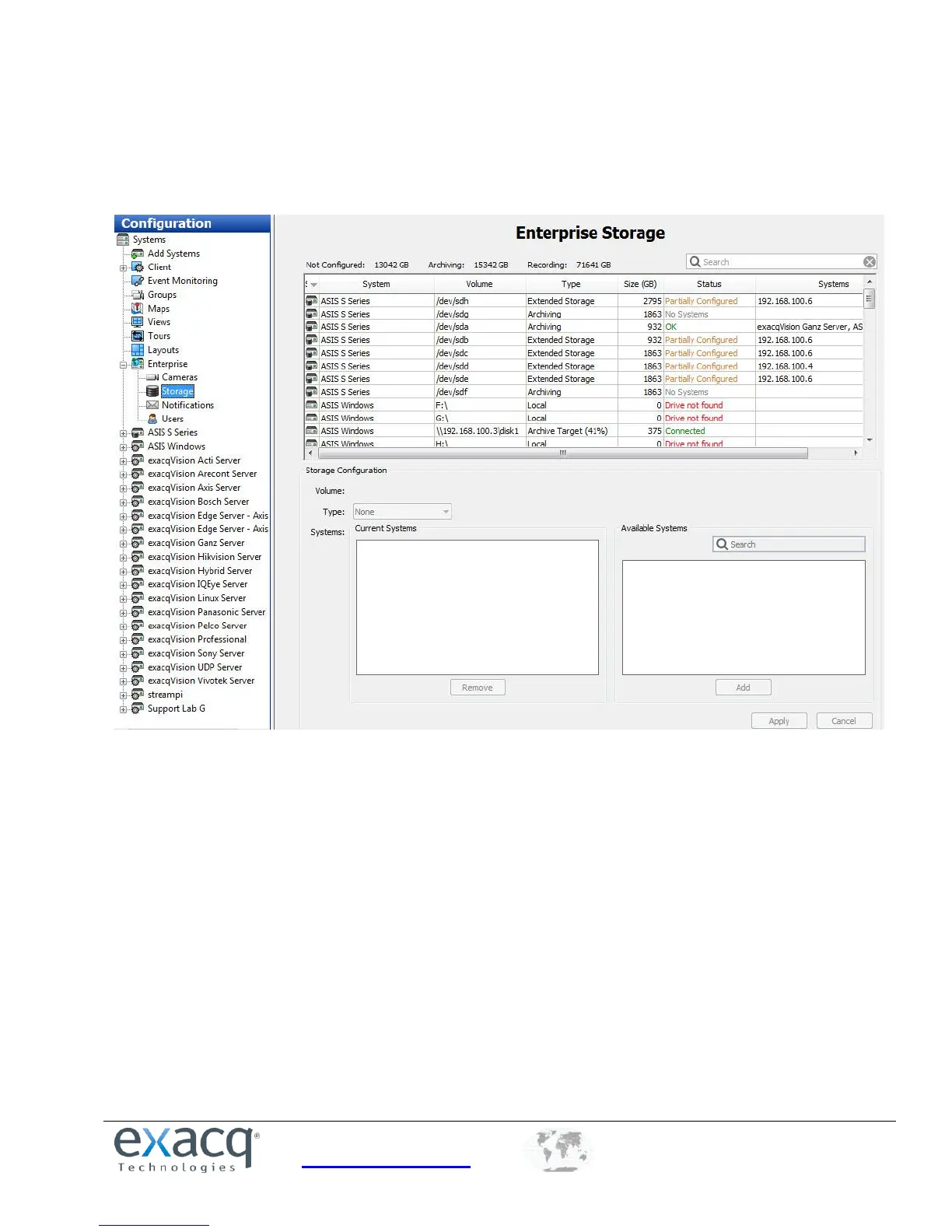 can select an S-Series partition, configure it for archiving or extended storage, and associate it with an exacqVision