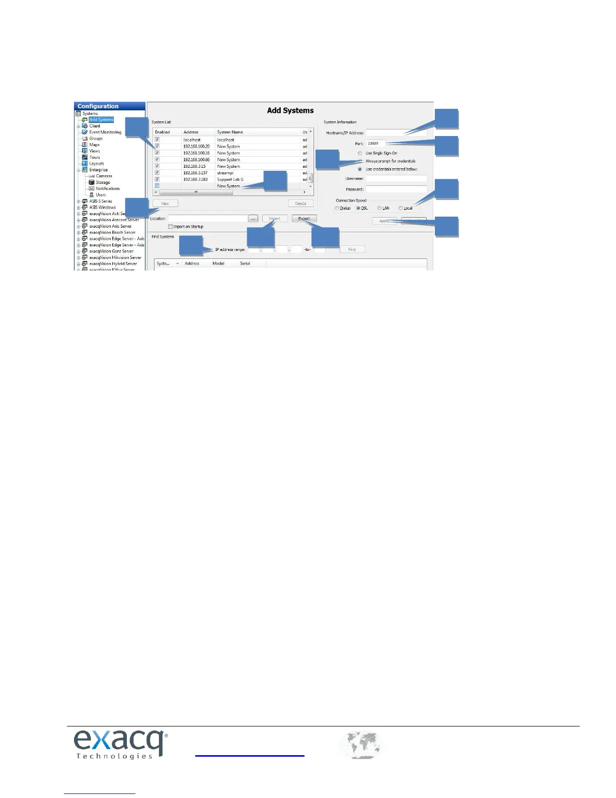 The Add Systems page allows you to add systems so that you can connect to them with exacqVision Client.