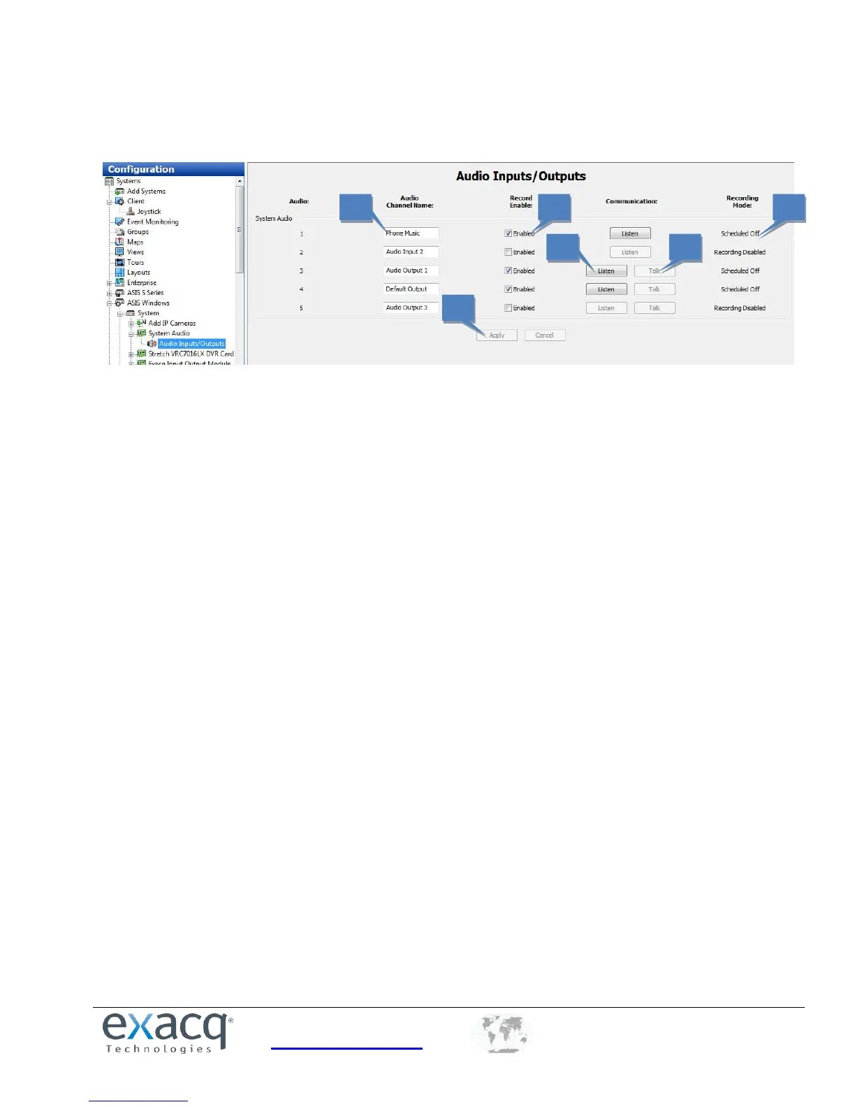 The Audio Inputs page allows you to name and enable the audio inputs you want to record. The exacqVision System ships