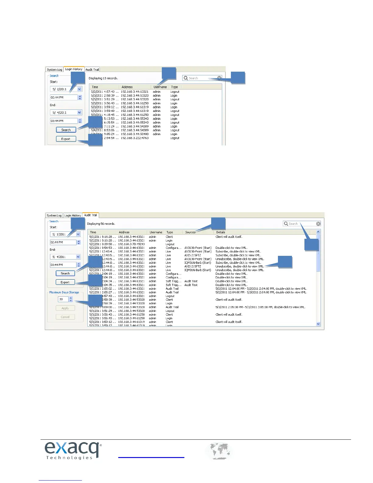 2. Click Search to list all login and logout actions in that time range.