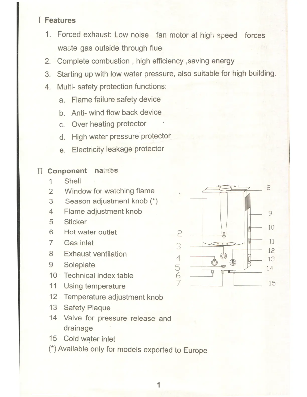 Excel JSQ20-20V - Key Features of EXCEL Water Heater; Performance Features; EXCEL Water Heater Component Identification; Unit Component Listing