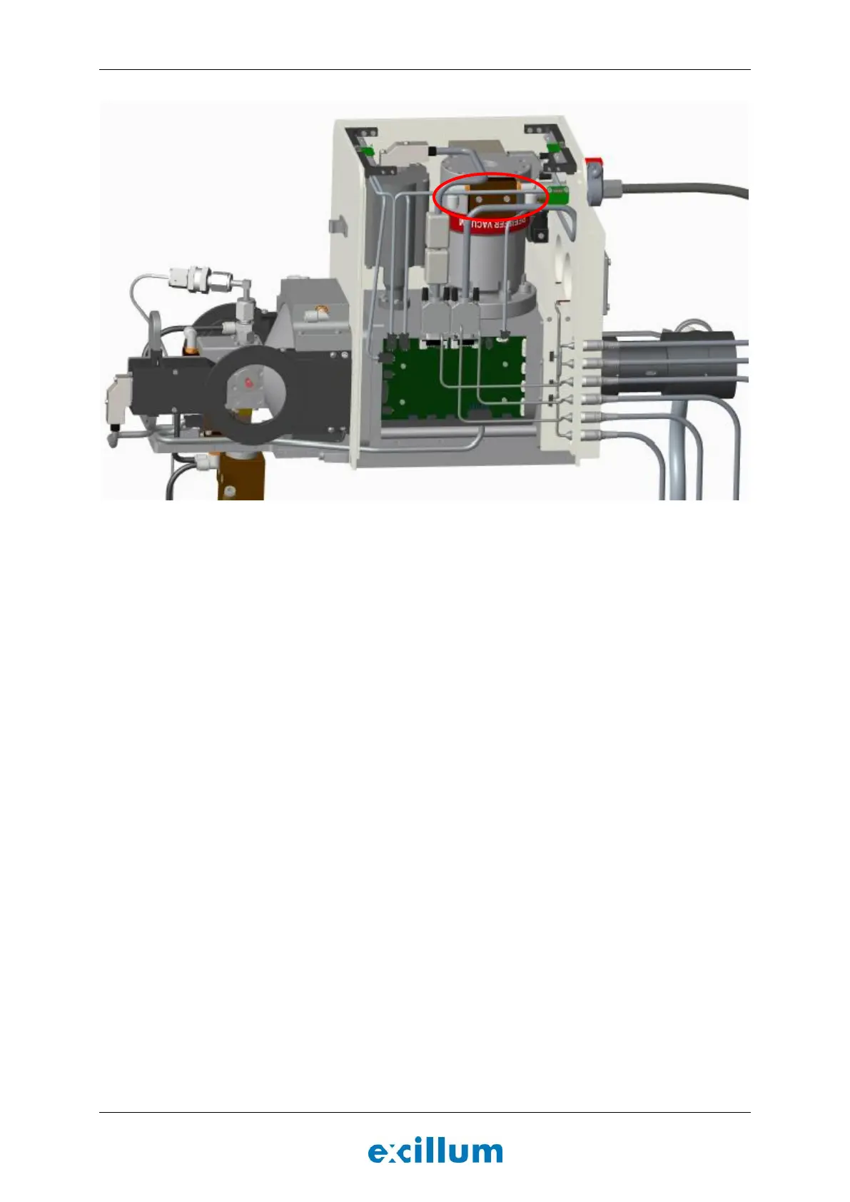 Figure 4-11. X-ray head with right hand cover removed. Turbo pump cooling block circled in red.