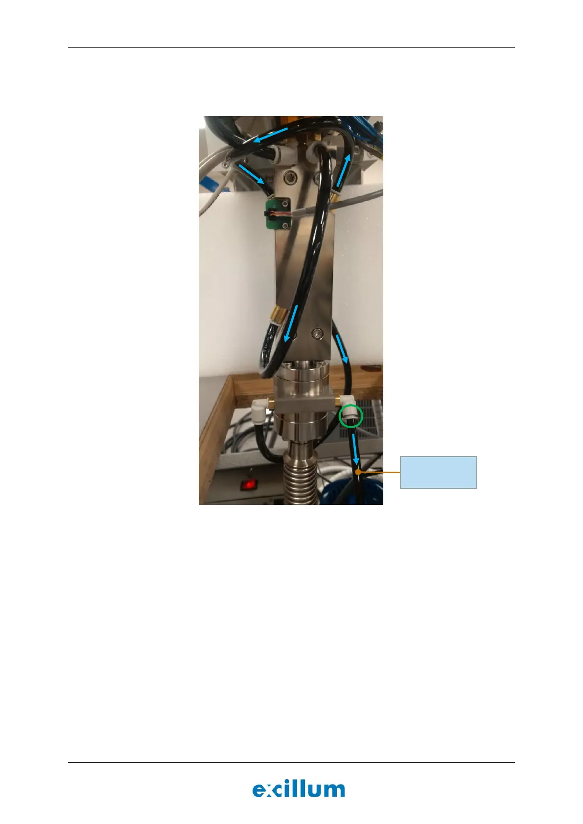 Figure 4-12. Upper cooling block with water hoses connected and flow direction indicated blue arrows.