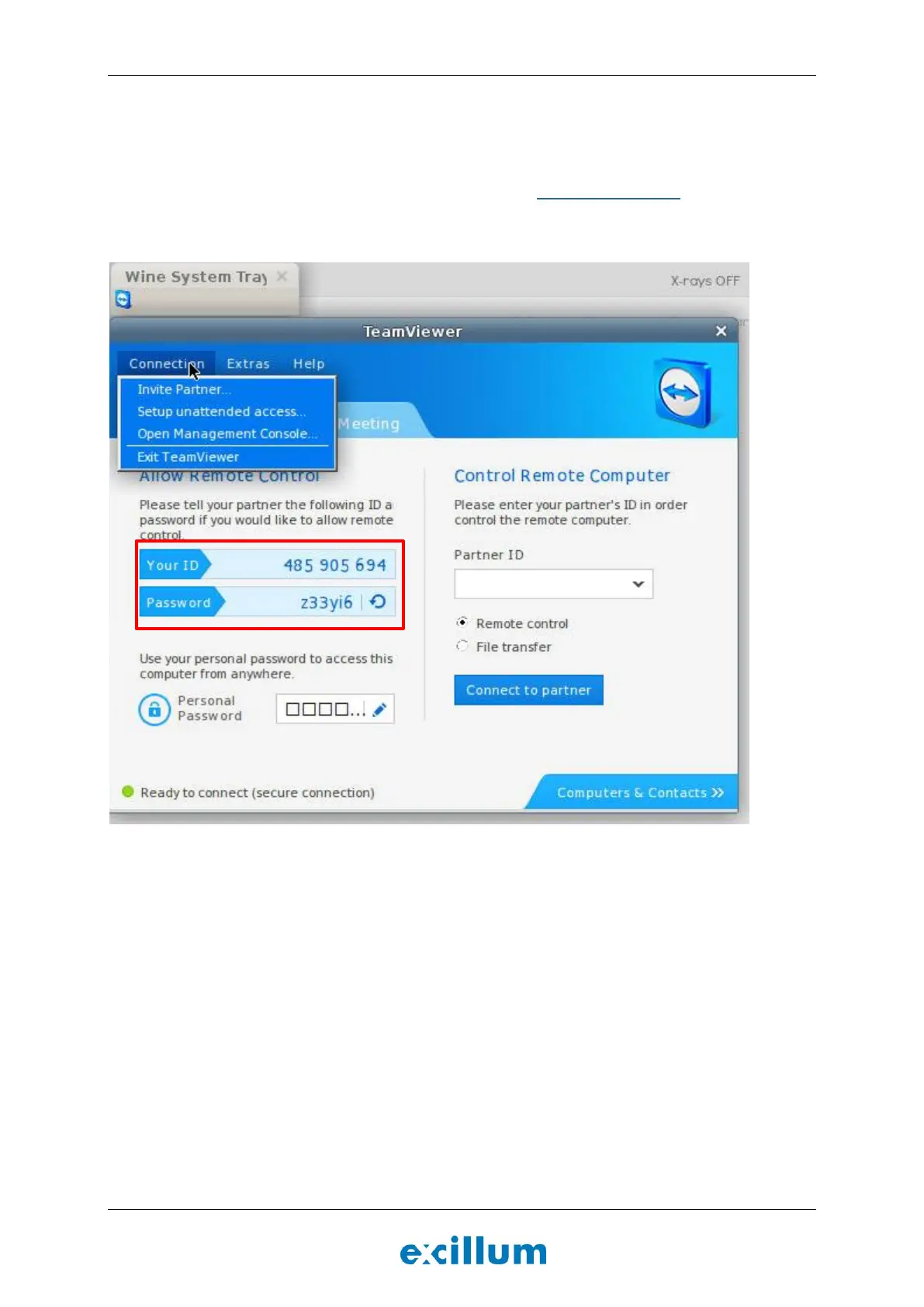 is started an ID number and a password is shown which can be used to invite Excillum support to assist with