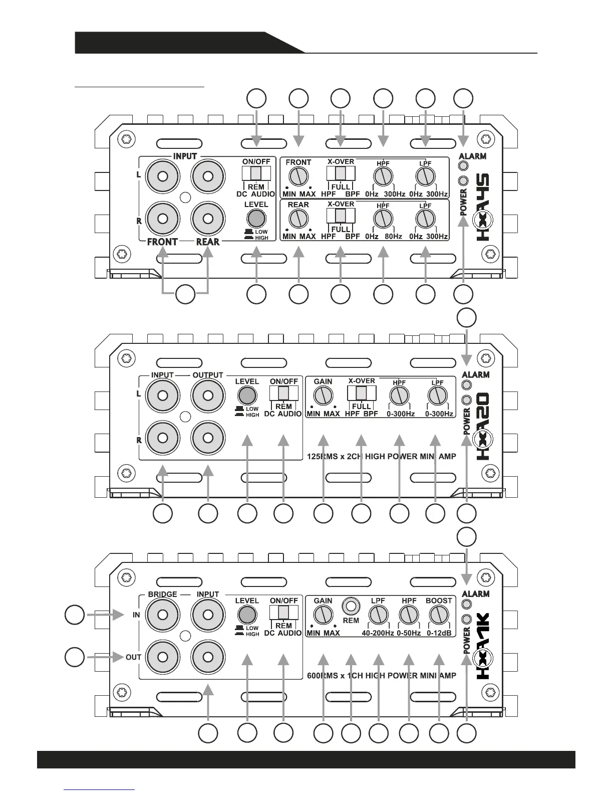 EXCURSION HXA2K - Front Panel Layout; 4-Channel Amplifier Front Panel Layout; 2-Channel Amplifier Front Panel Layout; Mono Amplifier Front Panel Layout