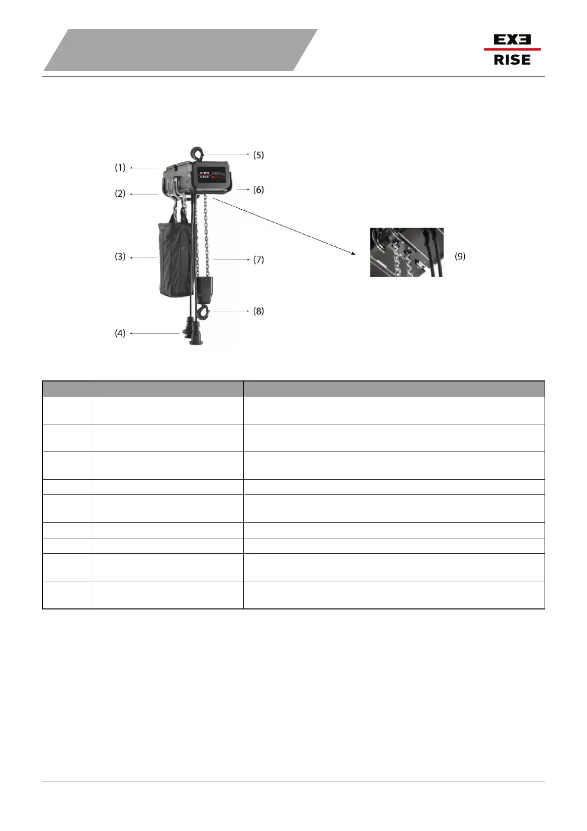 EXE RISE electric chain hoists consist of several components detailed in figure 3.3 and described.