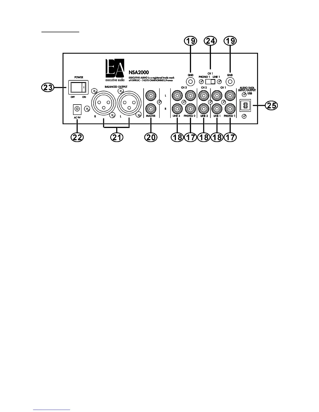 (20). The 3-pin XLR jacks send a high current balanced output signal. These jacks should be used when