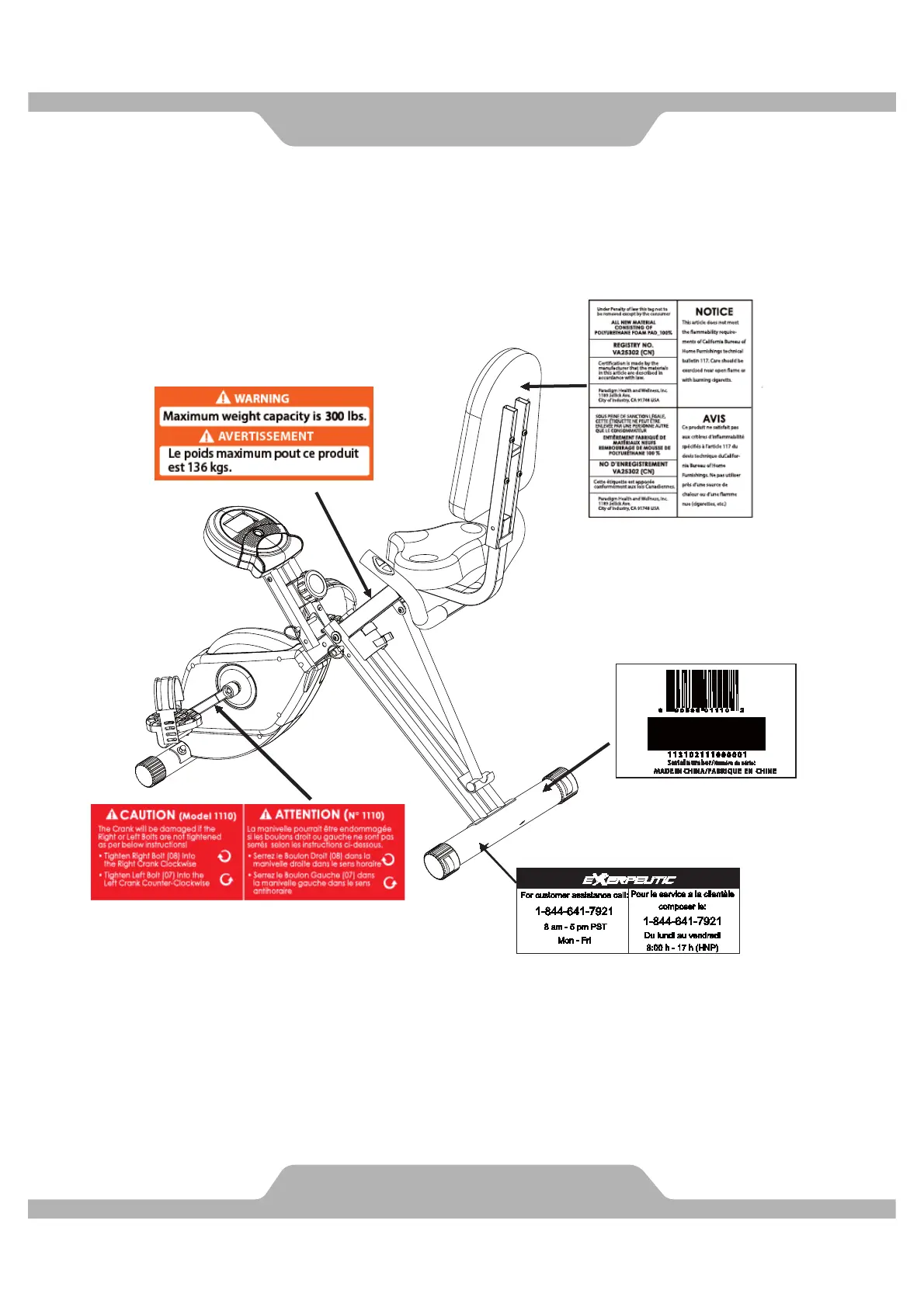 Exerpeutic 1110 - Label Placement and Warnings; Product Weight Capacity Warning; Crank Assembly Precautions