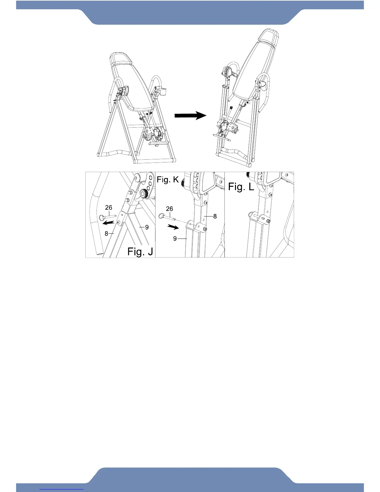 1. Pull out the Ring Pin (26) from the holes on the Rear Frame (8) and Front Frame (9). Fig. J