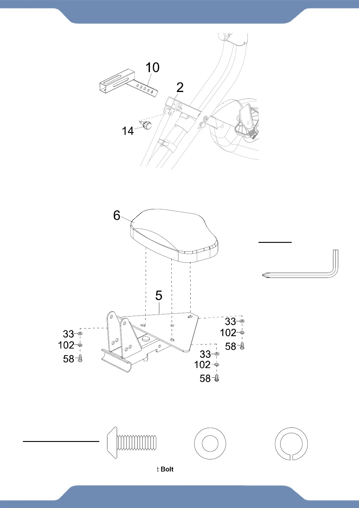 Attach the Seat (6) onto the Seat Bracket (5) using three Hexagon Socket Bolts (58), three