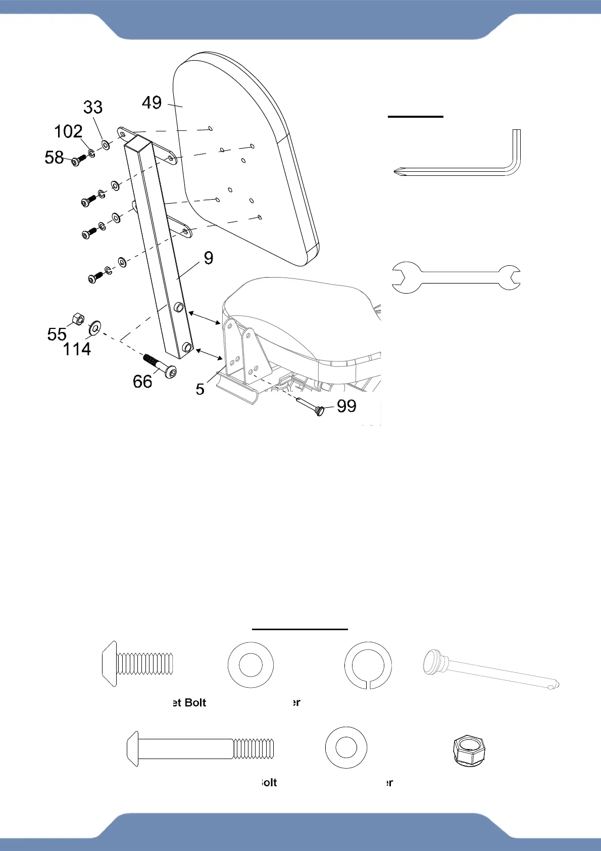 Attach the Backrest (49) onto the Backrest Frame (9) with four Hexagon Socket Bolts (58),