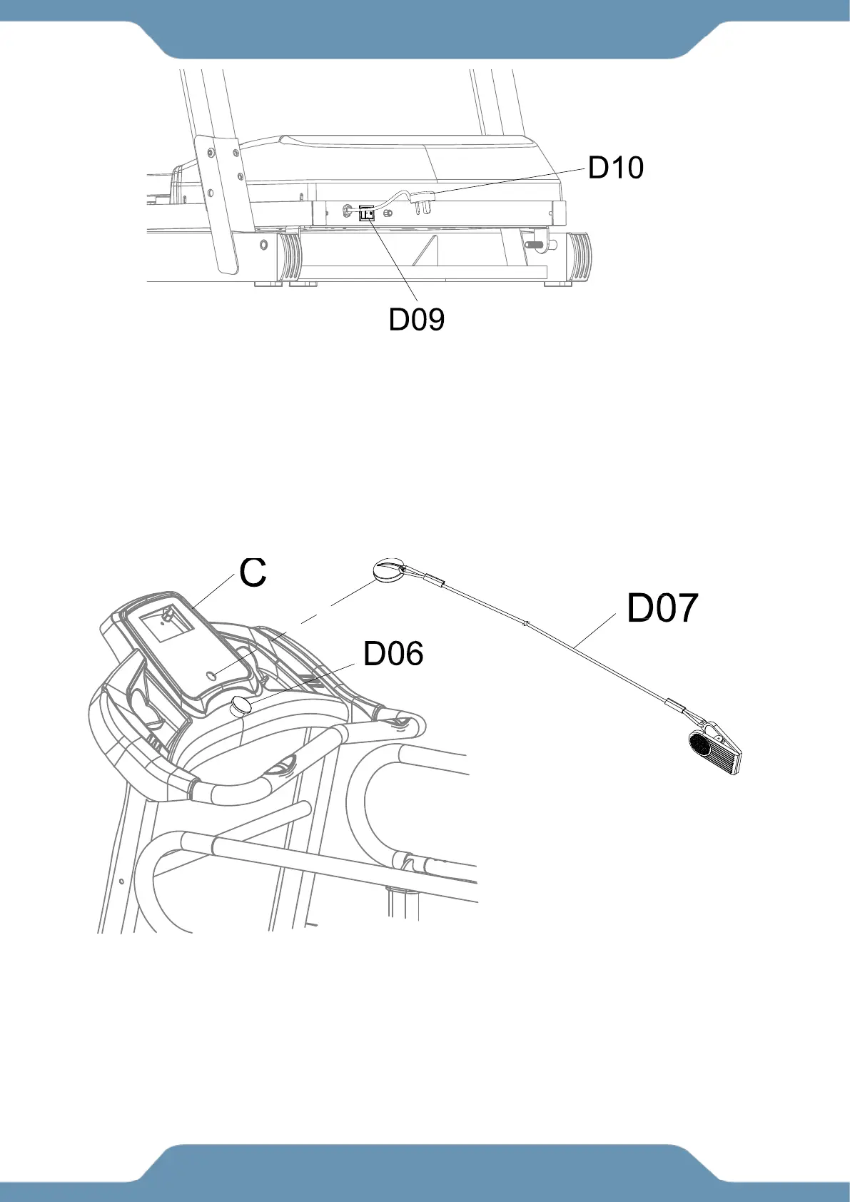 1. Attach the Safety Tether Key (D07) onto the Console Panel (C13) and start the treadmill.