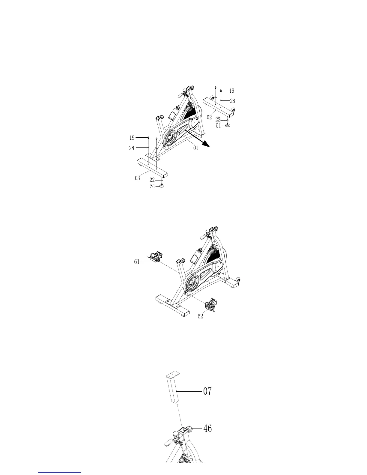 Refer to the figure below. Insert the Left Pedal (61) and Right Pedal (62) into the Crank. Tightening