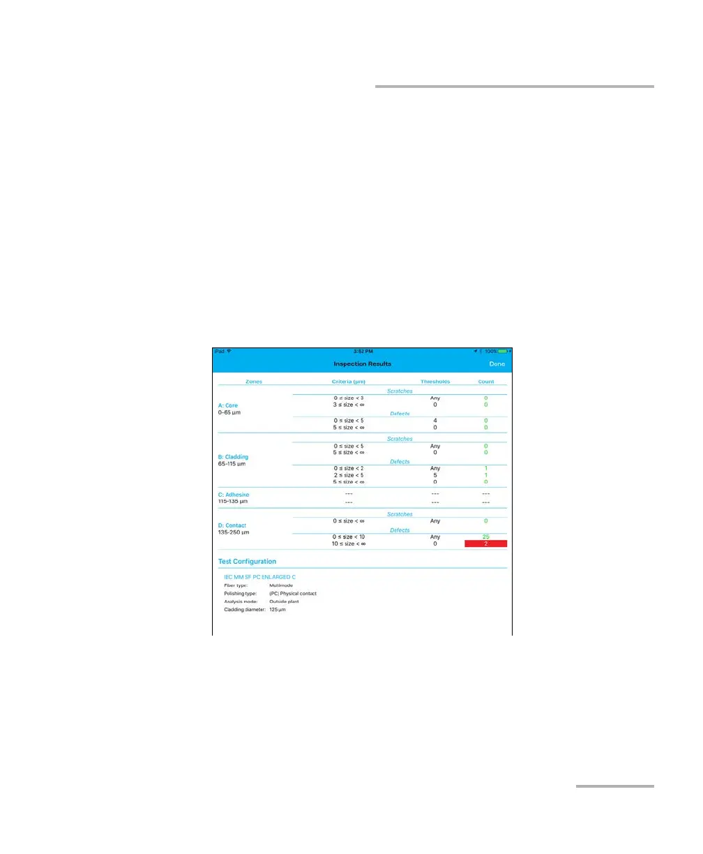 analysis zones, any anomaly (defects, scratches) found on the fiber