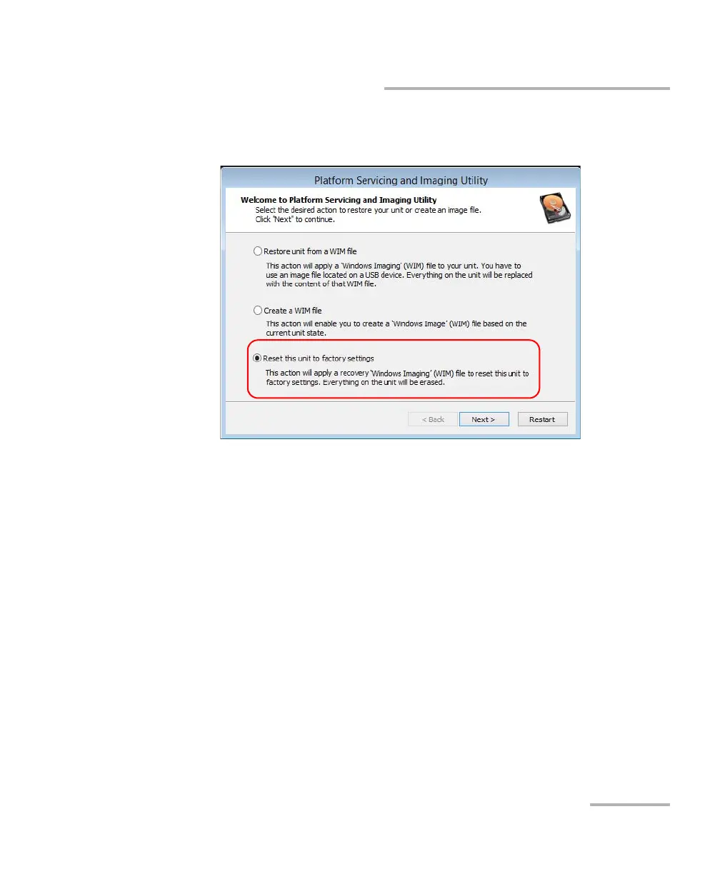 9. From the Platform Servicing and Imaging Utility wizard, select Reset