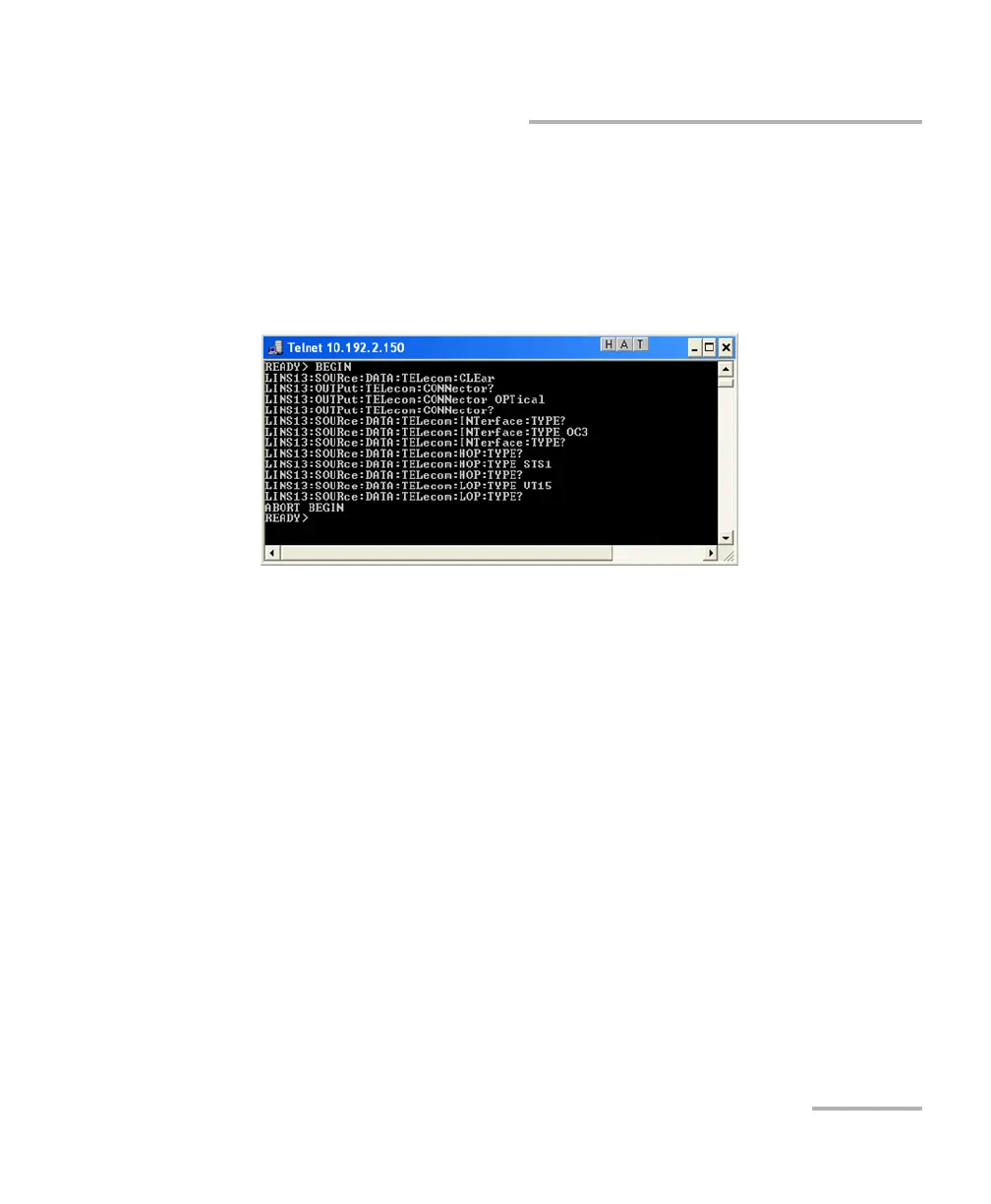 The ABORT BEGIN command stops the execution of the SCPI commands