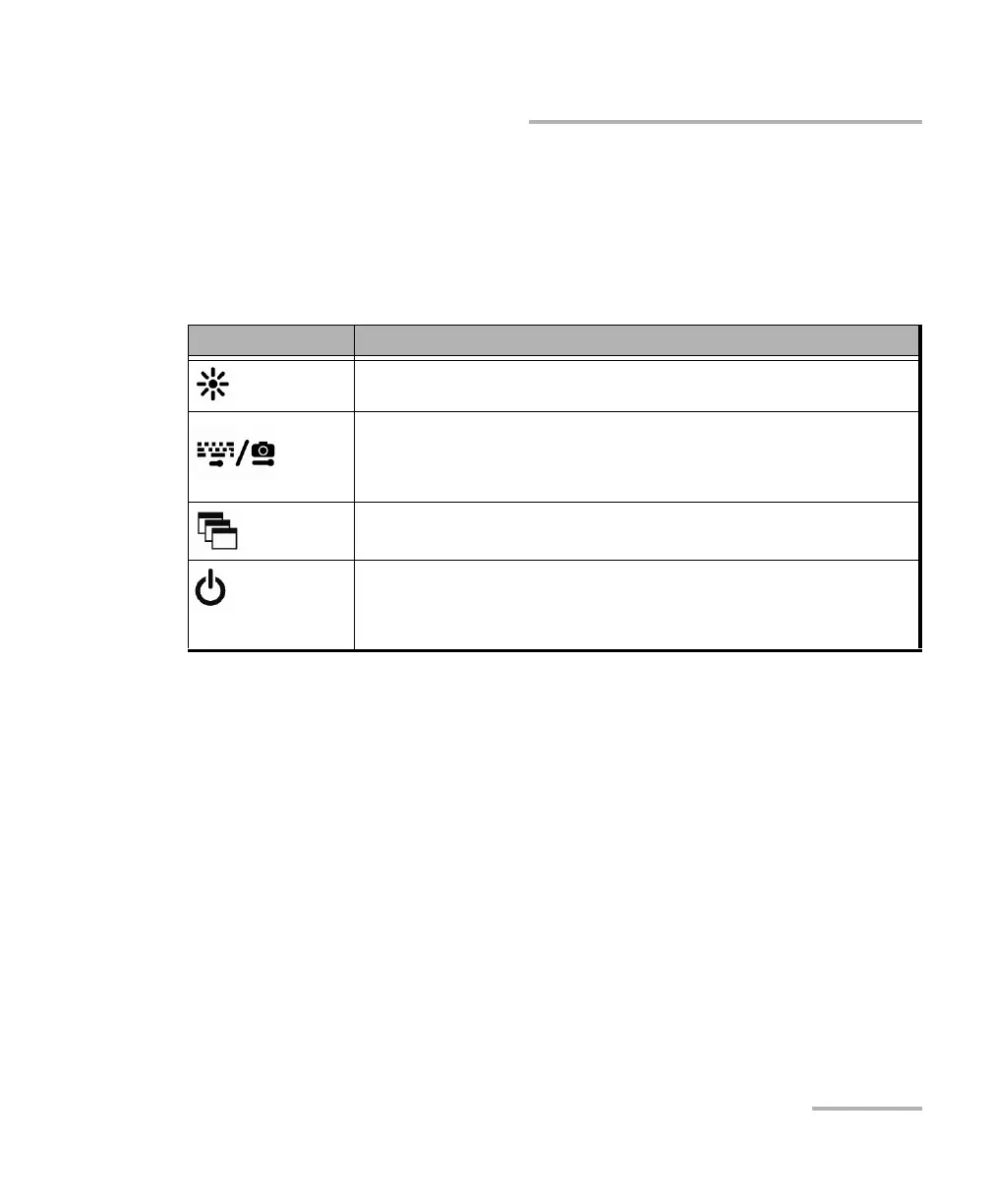Adjusts screen brightness (5 levels).