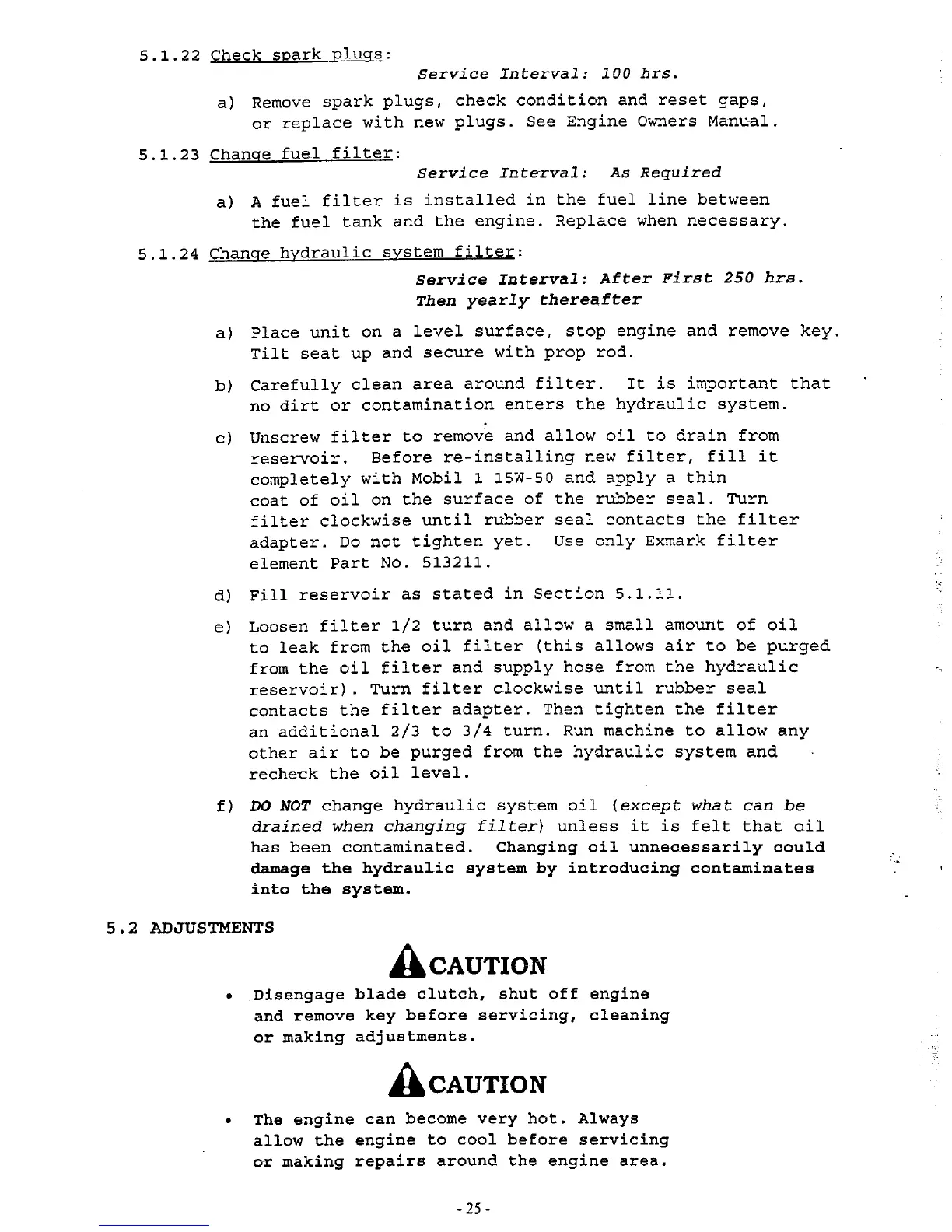 Exmark Explorer - Adjustments; Check Spark Plugs; Change Fuel Filter; Change Hydraulic System Filter