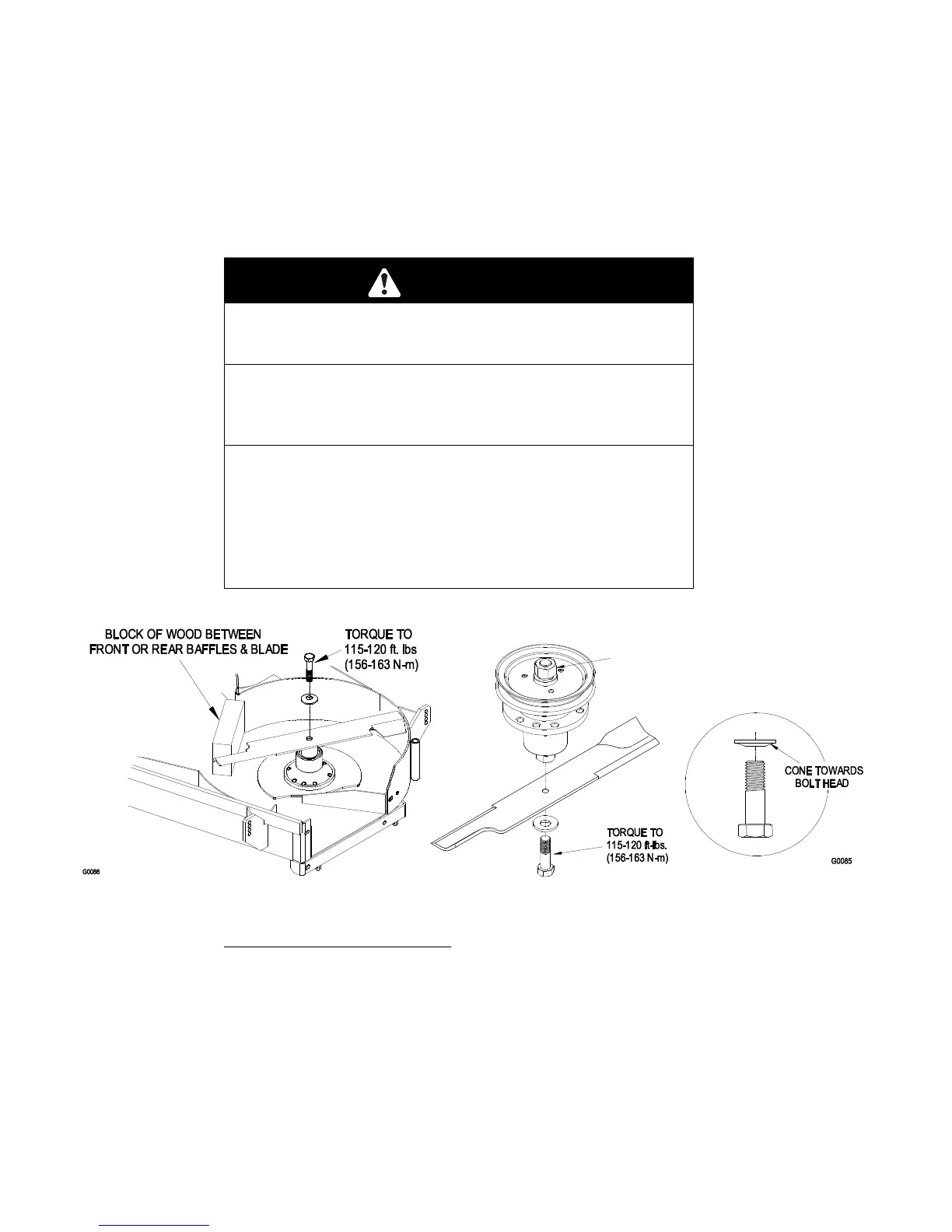 ♦ Torque the blade bolt to 115-120 ft. lbs. (156-163 N-m)