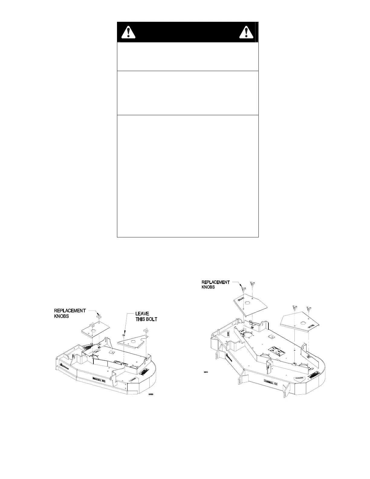 On the 44” deck replace the four capscrews with the knobs (Figure 2B).