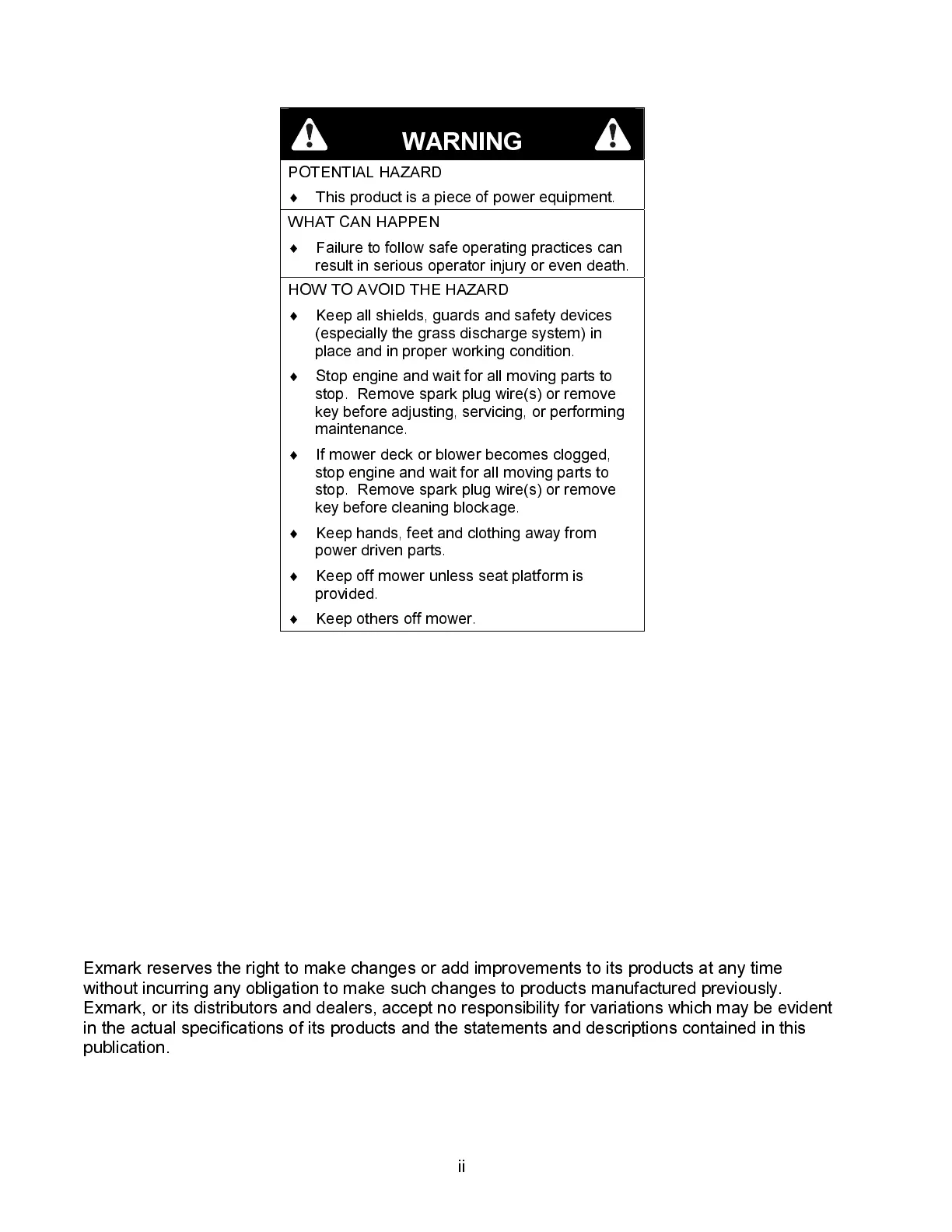 Exmark reserves the right to make changes or add improvements to its products at any time