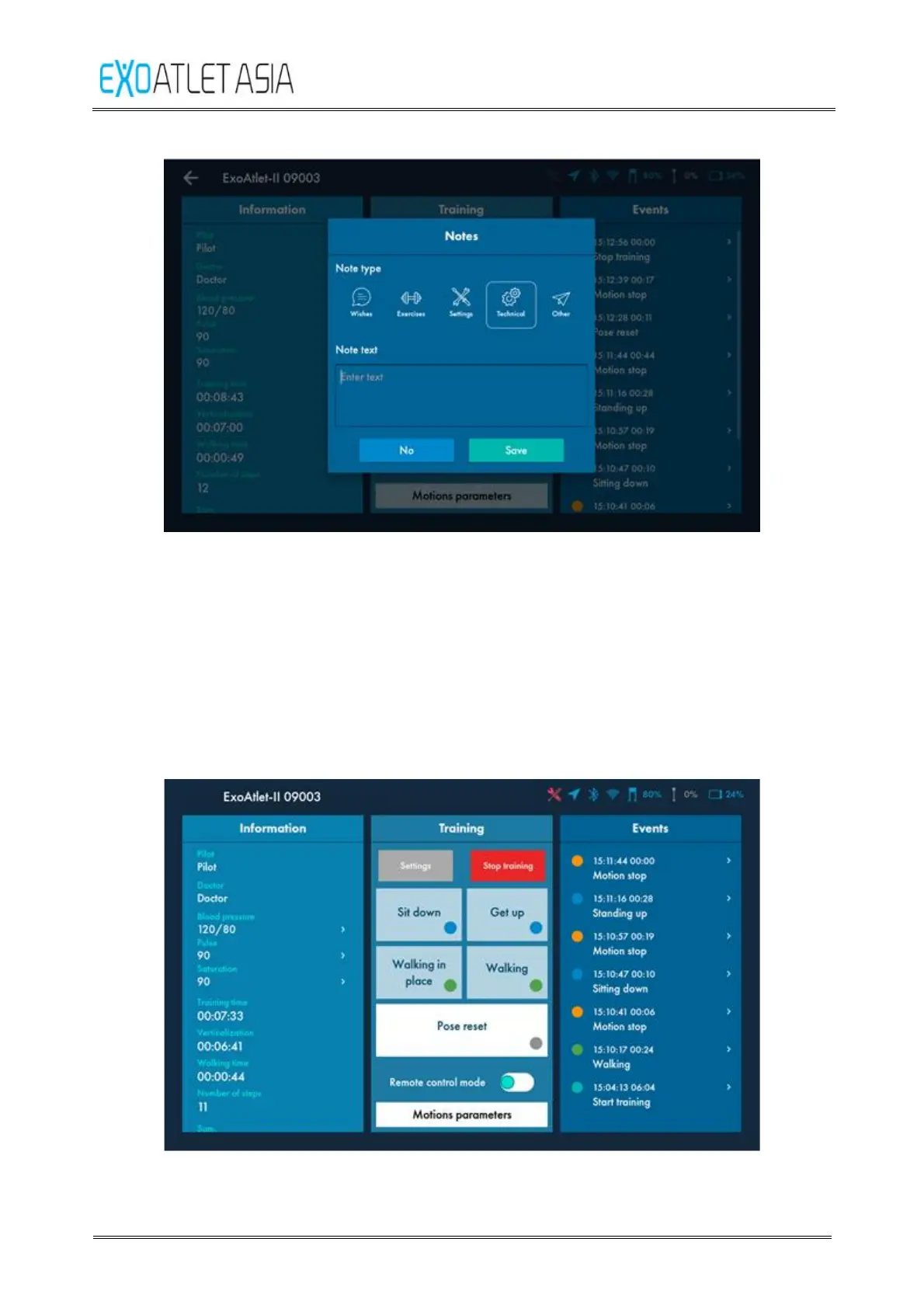 Available motion buttons depend on the current pose of the exoskeleton. There are