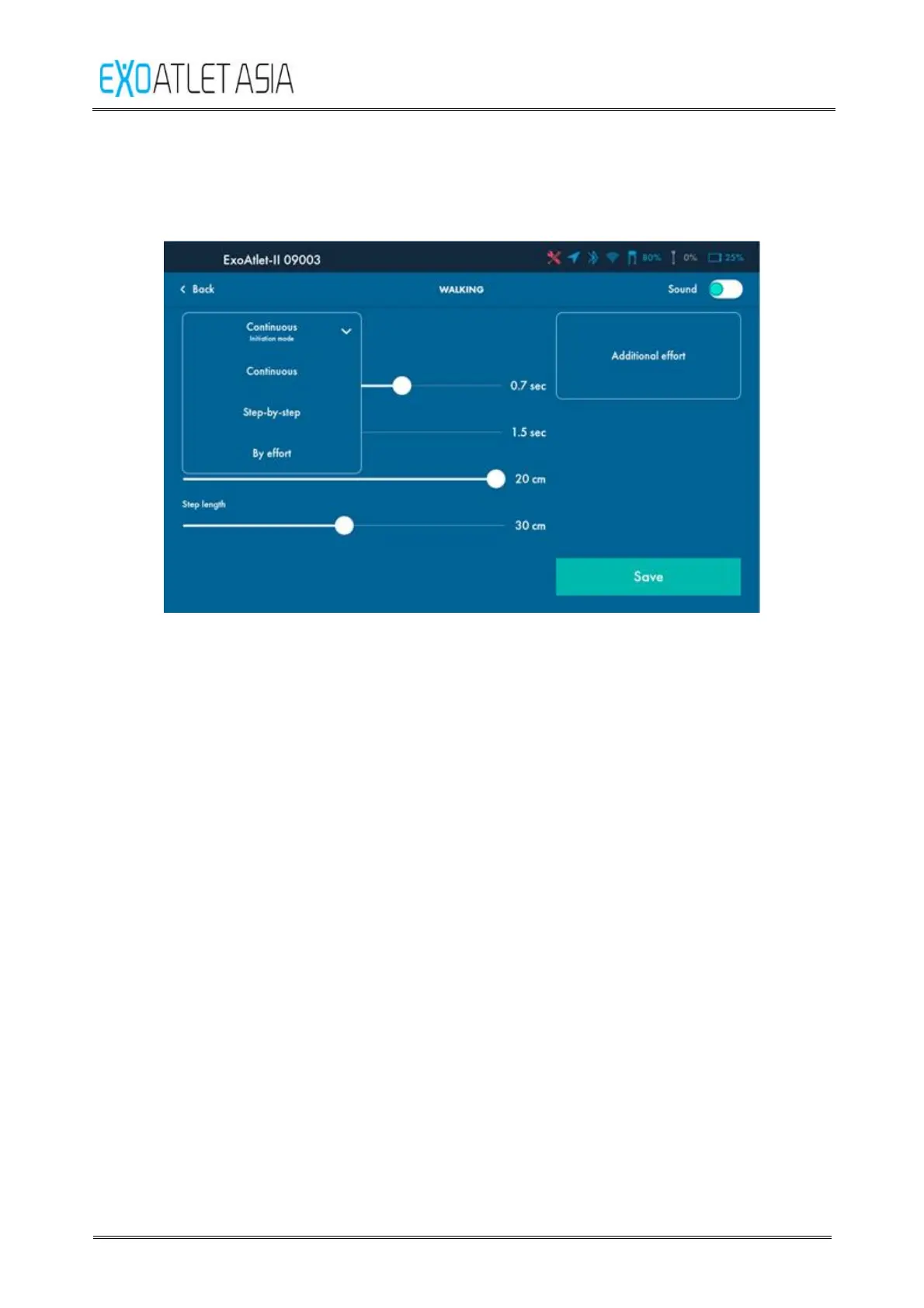 “Walking” button on Training screen – after 3 beeps exoskeleton starts continuous