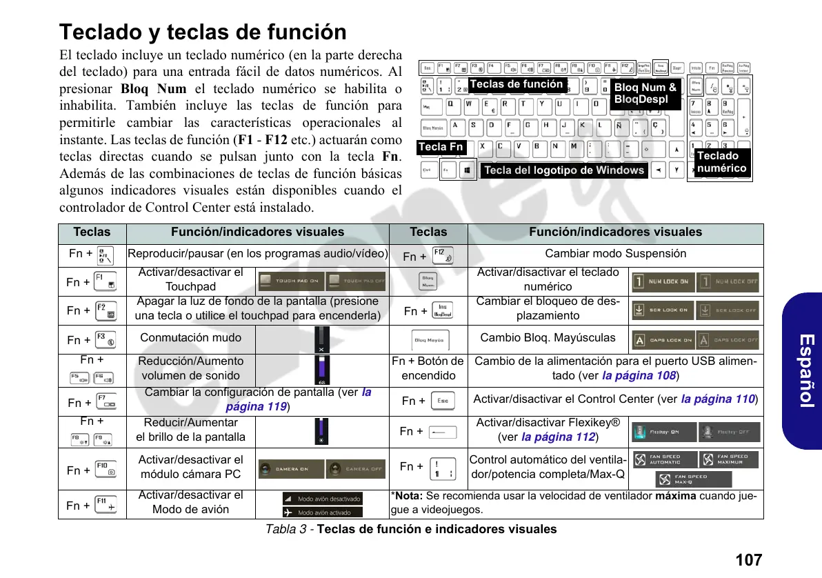 teclas directas cuando se pulsan junto con la tecla Fn.
