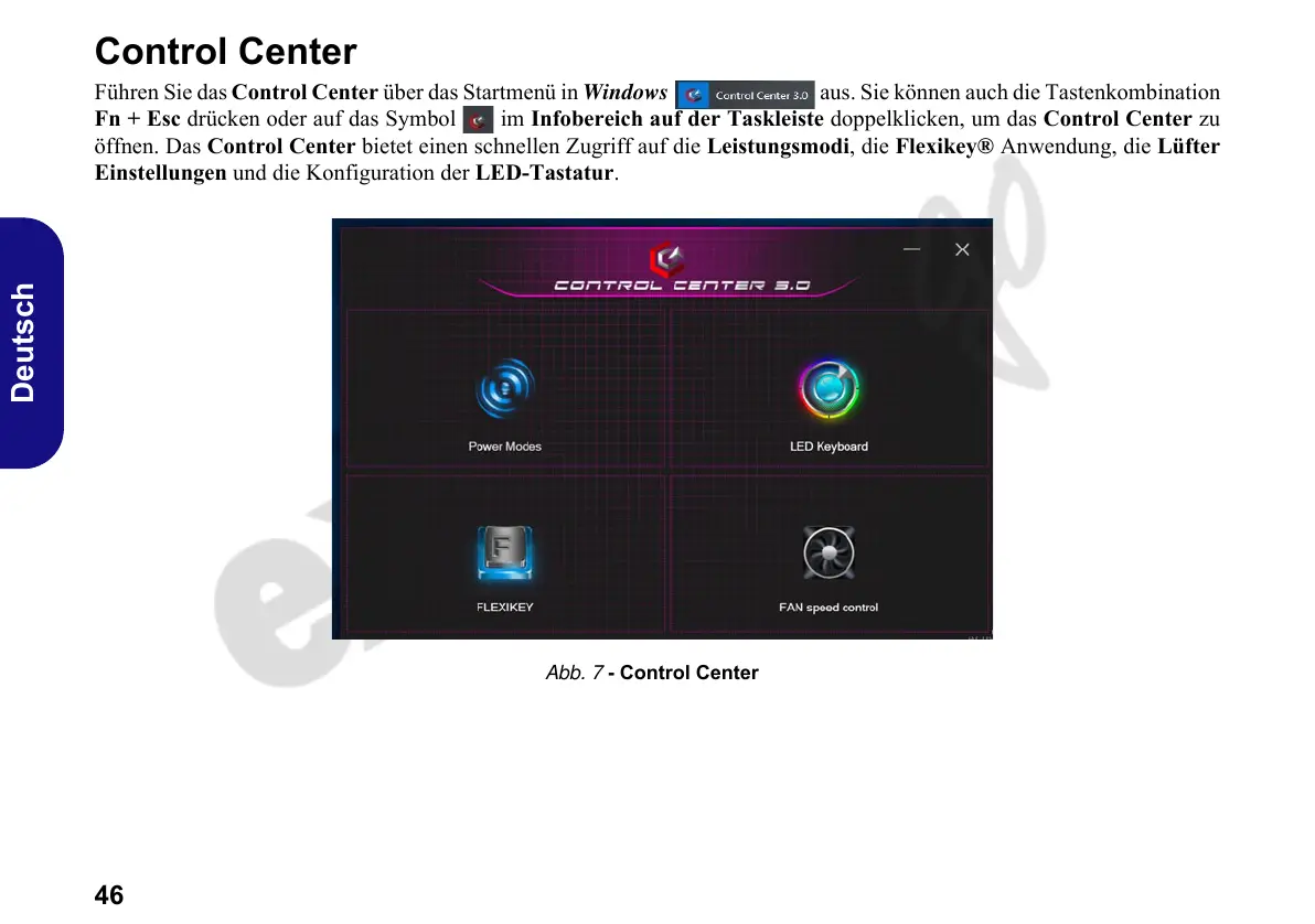 öffnen. Das Control Center bietet einen schnellen Zugriff auf die Leistungsmodi, die Flexikey® Anwendung, die Lüfter