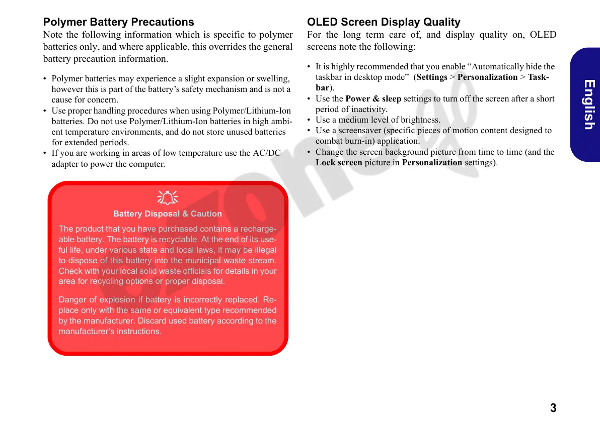 • Use proper handling procedures when using Polymer/Lithium-Ion