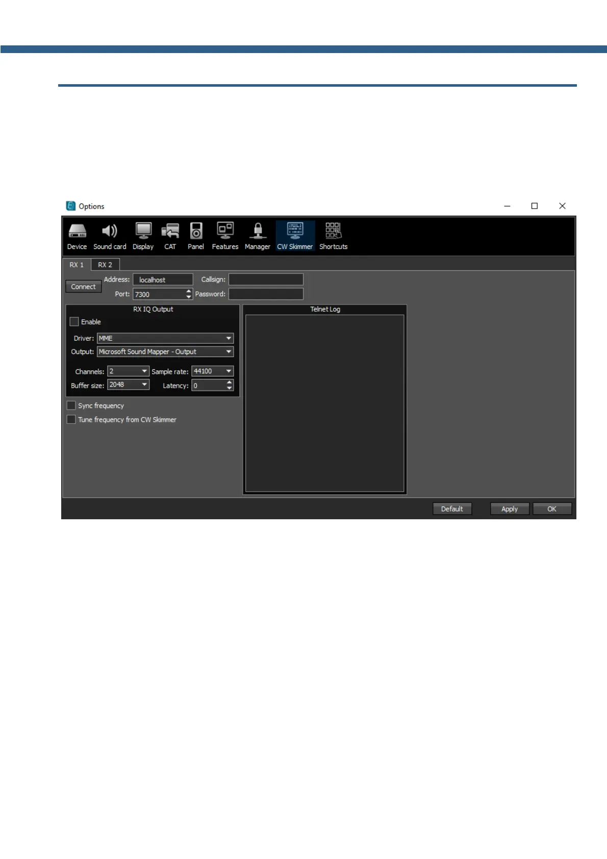 Settings in the CW Skimmer menu has two identical tabs RX1 and RX2 with connection