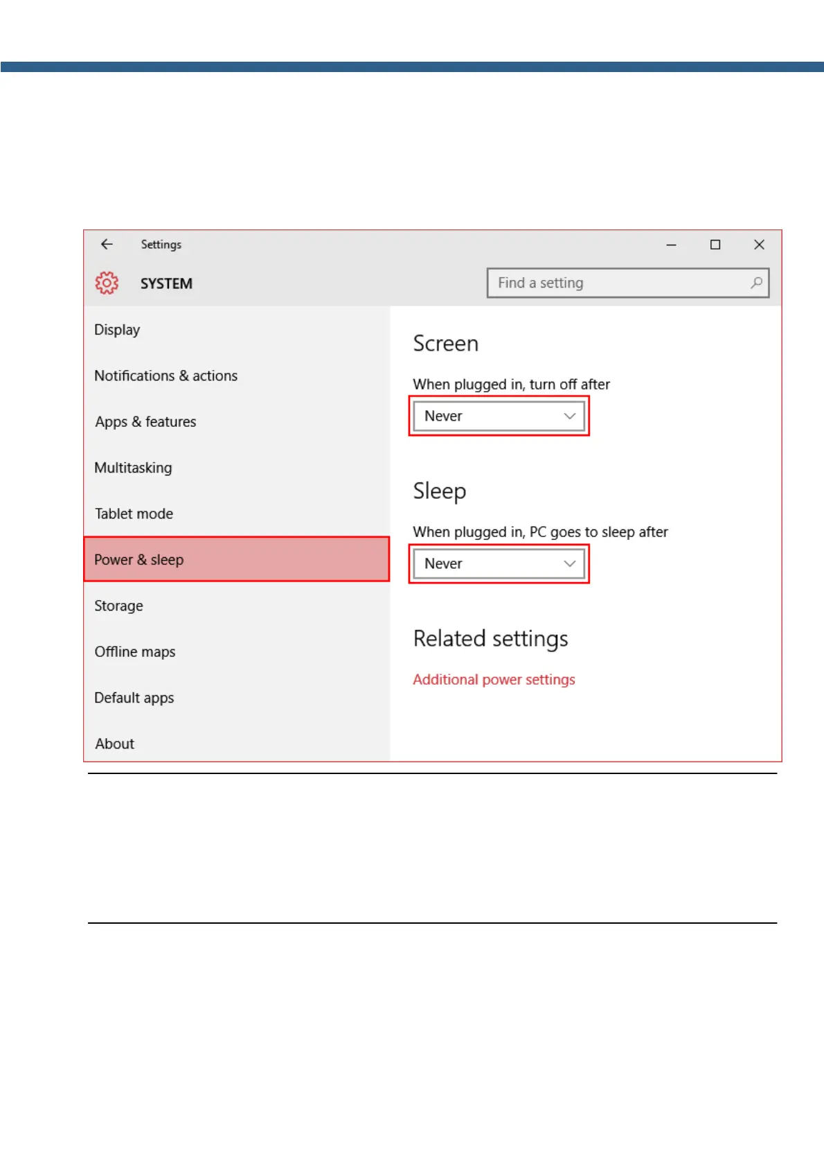 6. In the When plugged in, PC goes to sleep after drop-down menu select - Never.
