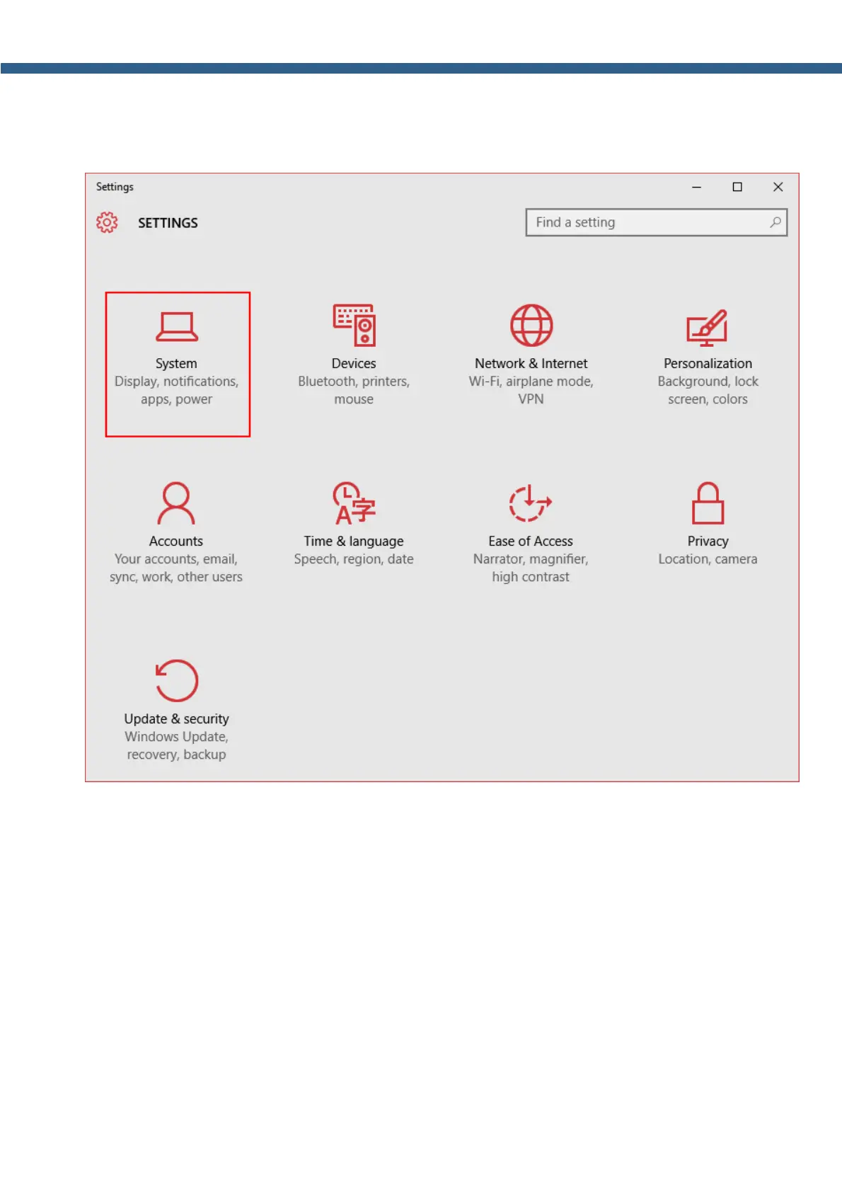 3. In the appeared Settings window select the System menu by the click of the left mouse