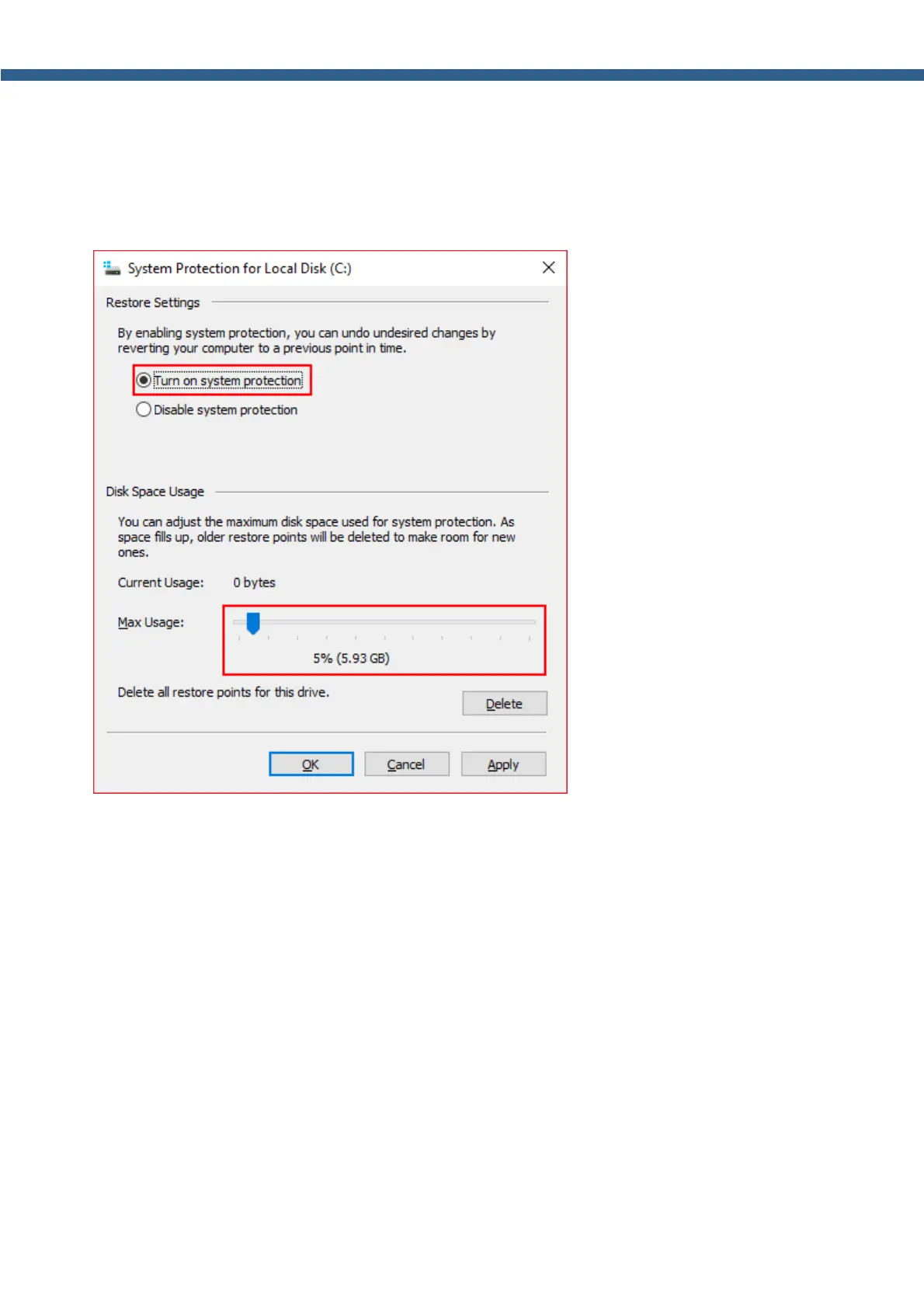 8. In the System Protection for Local DIsk (C:) window set the Turn on system