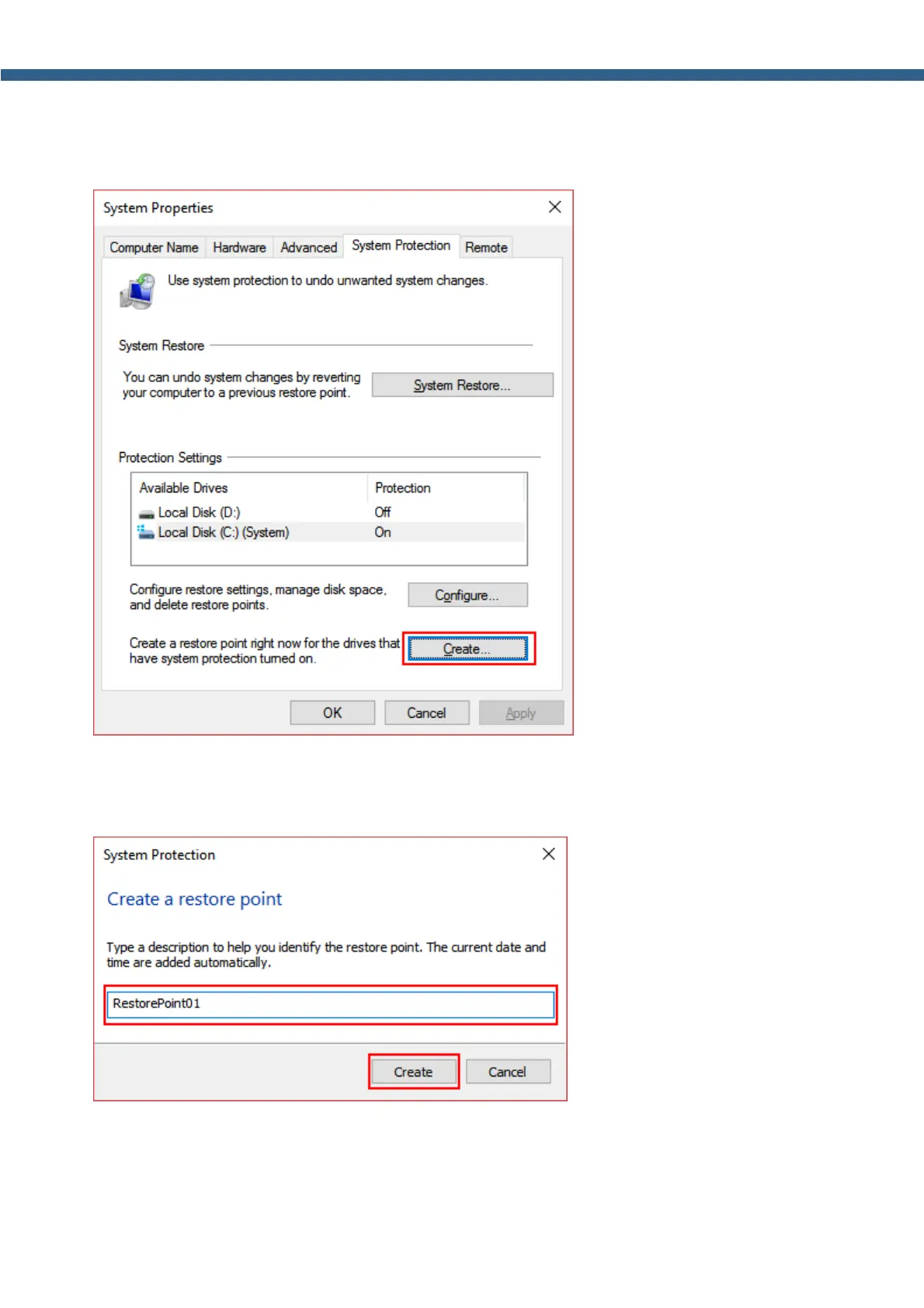 11. In the System Protection window enter the name of the restore point, then press the