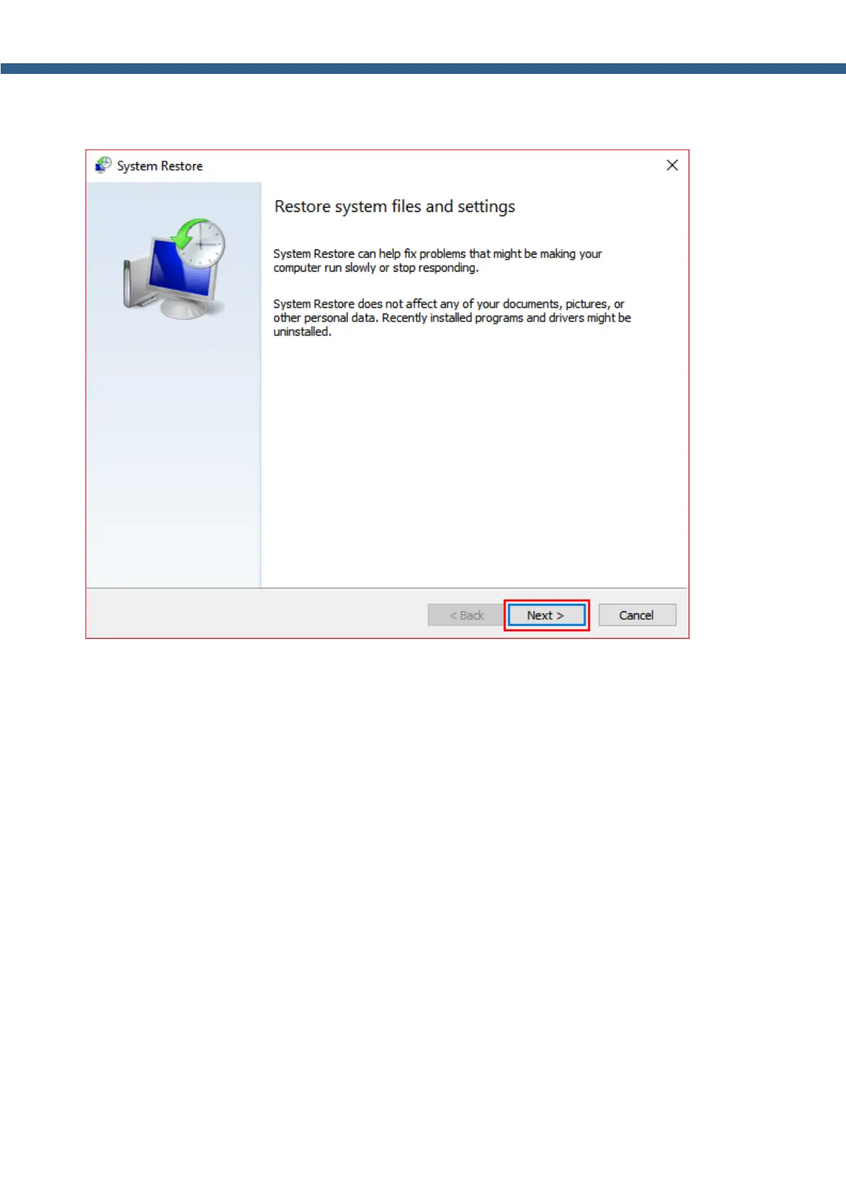 8. In the System Restore window press the Next button.