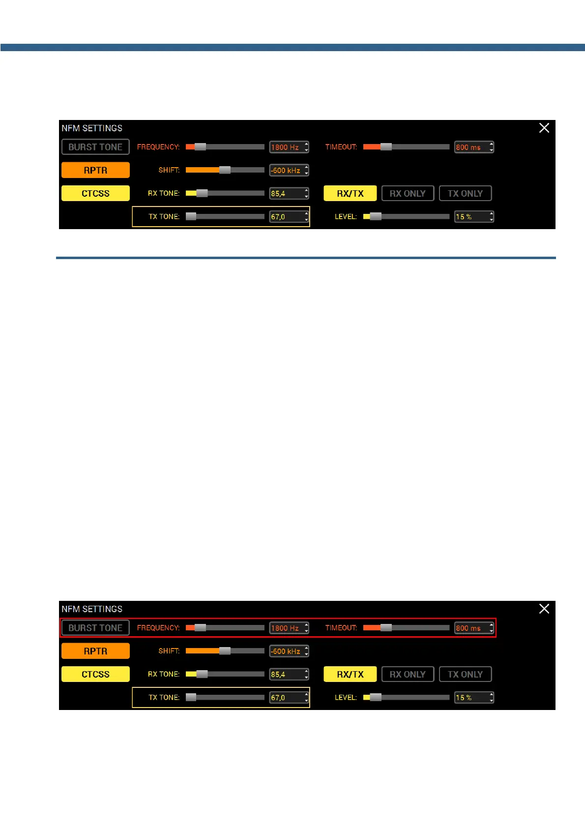2. Open the NFM local panel and set the tone frequency with the FREQUENCY slider or enter