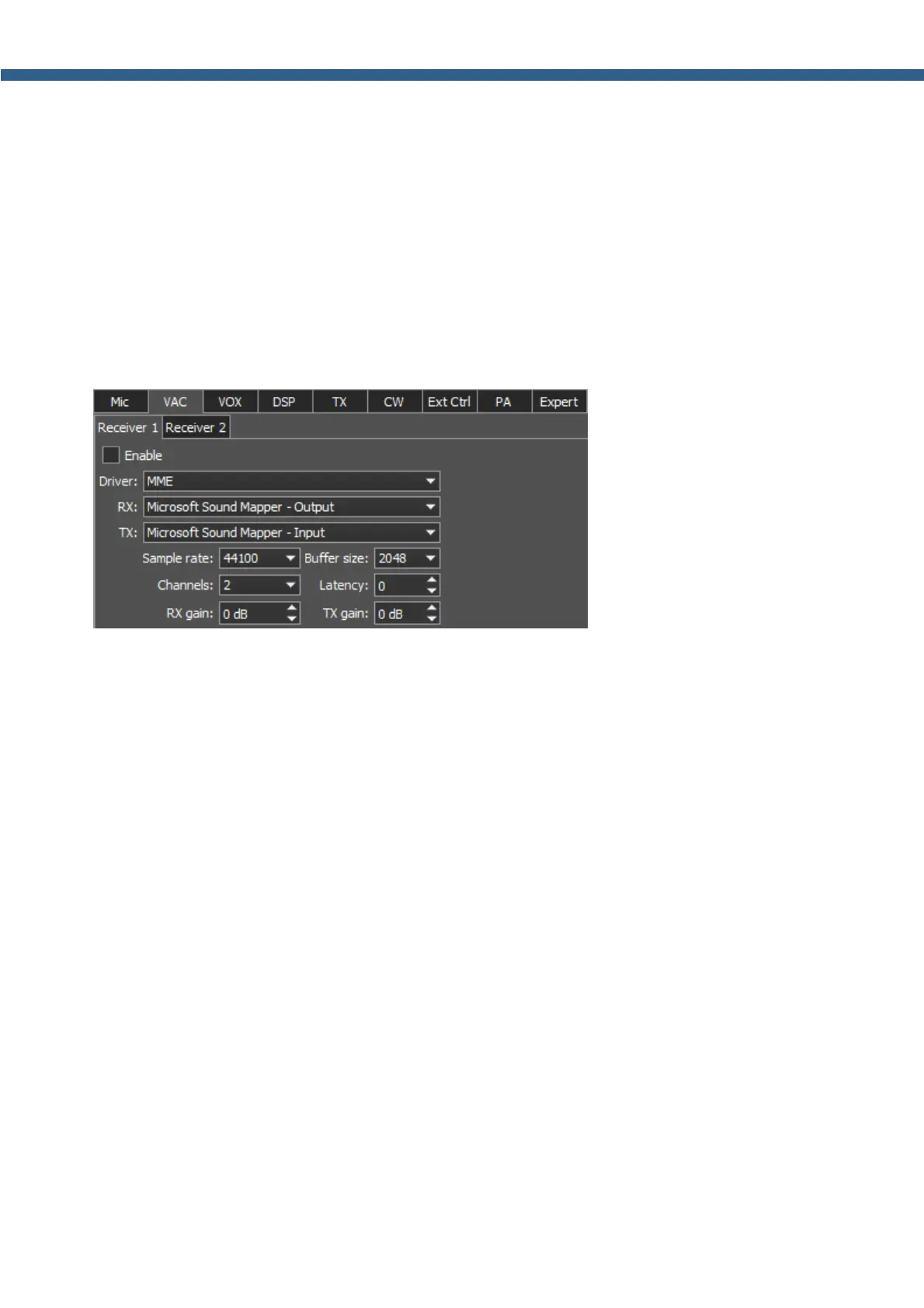 On the VAC tab you can see the settings of the audio device, which is used for operating with
