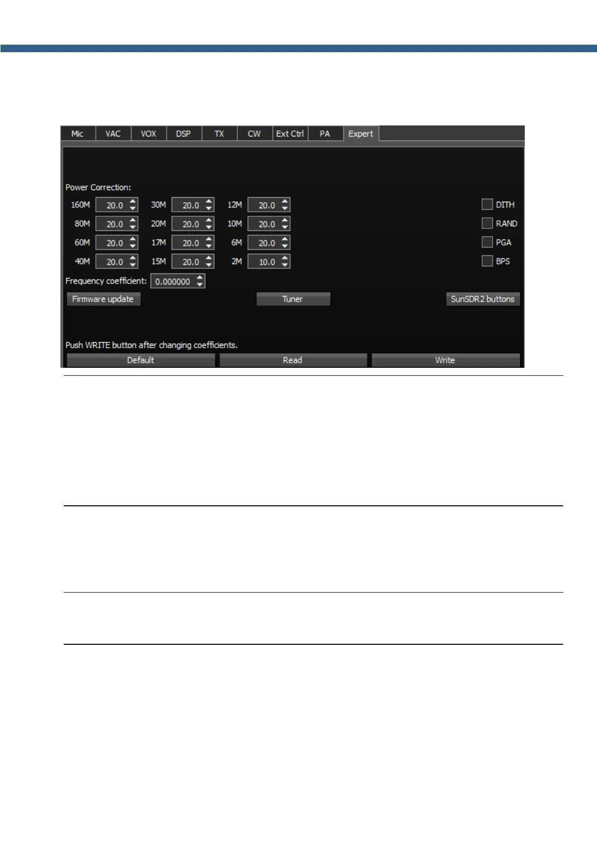 On the Expert tab you can see the fine hardware settings of the transceiver.