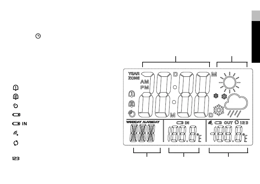 1. Time display, Date display or Alarm 1/2 display