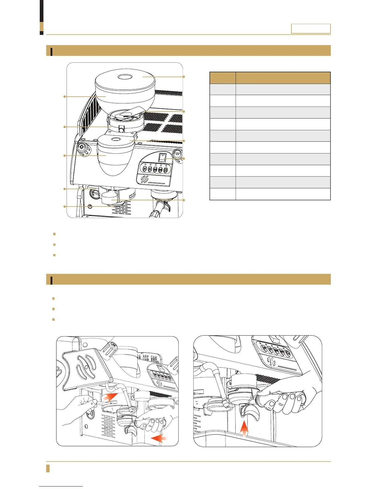 Place the porta lter under the coffee tamper (9) and push it upwards in order to compact the coffee.