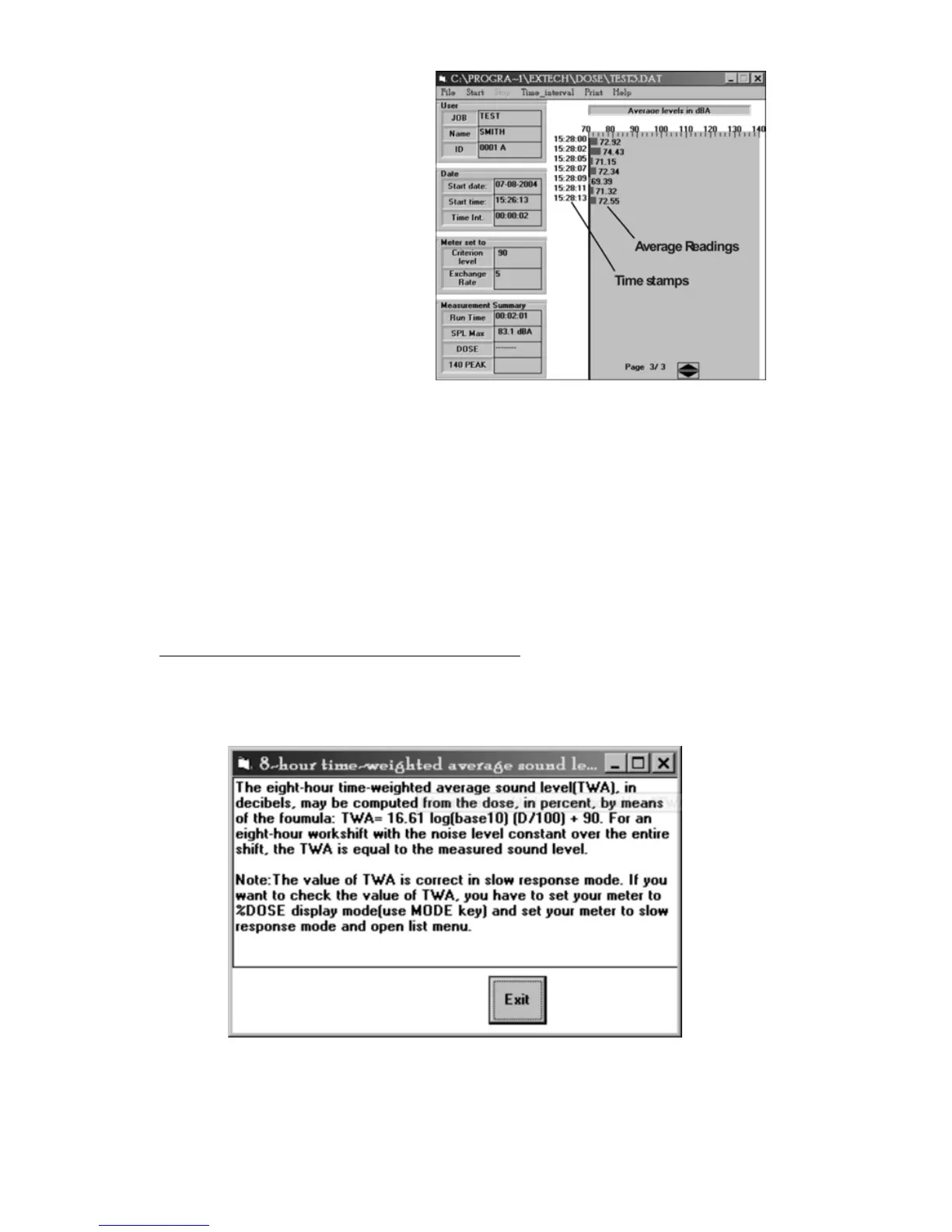TWA is the 8-hour projected average sound level in dB based on data collected from the